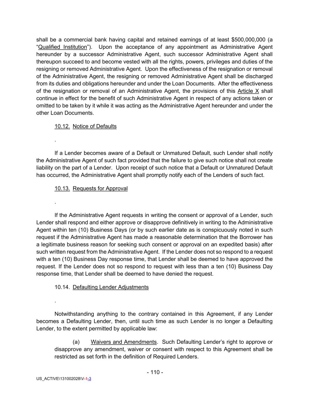 - 110 - US_ACTIVE\131002028\V-1-3 shall be a commercial bank having capital and retained earnings of at least $500,000,000 (a “Qualified Institution”). Upon the acceptance of any appointment as Administrative Agent hereunder by a successor Administrative Agent, such successor Administrative Agent shall thereupon succeed to and become vested with all the rights, powers, privileges and duties of the resigning or removed Administrative Agent. Upon the effectiveness of the resignation or removal of the Administrative Agent, the resigning or removed Administrative Agent shall be discharged from its duties and obligations hereunder and under the Loan Documents. After the effectiveness of the resignation or removal of an Administrative Agent, the provisions of this Article X shall continue in effect for the benefit of such Administrative Agent in respect of any actions taken or omitted to be taken by it while it was acting as the Administrative Agent hereunder and under the other Loan Documents. 10.12. Notice of Defaults . If a Lender becomes aware of a Default or Unmatured Default, such Lender shall notify the Administrative Agent of such fact provided that the failure to give such notice shall not create liability on the part of a Lender. Upon receipt of such notice that a Default or Unmatured Default has occurred, the Administrative Agent shall promptly notify each of the Lenders of such fact. 10.13. Requests for Approval . If the Administrative Agent requests in writing the consent or approval of a Lender, such Lender shall respond and either approve or disapprove definitively in writing to the Administrative Agent within ten (10) Business Days (or by such earlier date as is conspicuously noted in such request if the Administrative Agent has made a reasonable determination that the Borrower has a legitimate business reason for seeking such consent or approval on an expedited basis) after such written request from the Administrative Agent. If the Lender does not so respond to a request with a ten (10) Business Day response time, that Lender shall be deemed to have approved the request. If the Lender does not so respond to request with less than a ten (10) Business Day response time, that Lender shall be deemed to have denied the request. 10.14. Defaulting Lender Adjustments . Notwithstanding anything to the contrary contained in this Agreement, if any Lender becomes a Defaulting Lender, then, until such time as such Lender is no longer a Defaulting Lender, to the extent permitted by applicable law: (a) Waivers and Amendments. Such Defaulting Lender’s right to approve or disapprove any amendment, waiver or consent with respect to this Agreement shall be restricted as set forth in the definition of Required Lenders.
