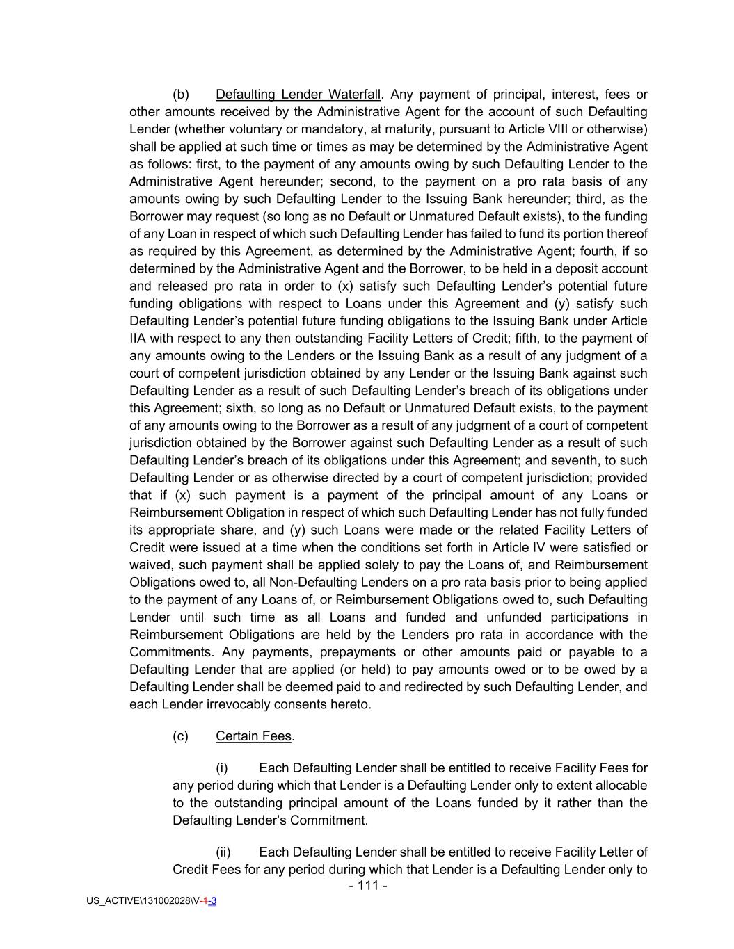 - 111 - US_ACTIVE\131002028\V-1-3 (b) Defaulting Lender Waterfall. Any payment of principal, interest, fees or other amounts received by the Administrative Agent for the account of such Defaulting Lender (whether voluntary or mandatory, at maturity, pursuant to Article VIII or otherwise) shall be applied at such time or times as may be determined by the Administrative Agent as follows: first, to the payment of any amounts owing by such Defaulting Lender to the Administrative Agent hereunder; second, to the payment on a pro rata basis of any amounts owing by such Defaulting Lender to the Issuing Bank hereunder; third, as the Borrower may request (so long as no Default or Unmatured Default exists), to the funding of any Loan in respect of which such Defaulting Lender has failed to fund its portion thereof as required by this Agreement, as determined by the Administrative Agent; fourth, if so determined by the Administrative Agent and the Borrower, to be held in a deposit account and released pro rata in order to (x) satisfy such Defaulting Lender’s potential future funding obligations with respect to Loans under this Agreement and (y) satisfy such Defaulting Lender’s potential future funding obligations to the Issuing Bank under Article IIA with respect to any then outstanding Facility Letters of Credit; fifth, to the payment of any amounts owing to the Lenders or the Issuing Bank as a result of any judgment of a court of competent jurisdiction obtained by any Lender or the Issuing Bank against such Defaulting Lender as a result of such Defaulting Lender’s breach of its obligations under this Agreement; sixth, so long as no Default or Unmatured Default exists, to the payment of any amounts owing to the Borrower as a result of any judgment of a court of competent jurisdiction obtained by the Borrower against such Defaulting Lender as a result of such Defaulting Lender’s breach of its obligations under this Agreement; and seventh, to such Defaulting Lender or as otherwise directed by a court of competent jurisdiction; provided that if (x) such payment is a payment of the principal amount of any Loans or Reimbursement Obligation in respect of which such Defaulting Lender has not fully funded its appropriate share, and (y) such Loans were made or the related Facility Letters of Credit were issued at a time when the conditions set forth in Article IV were satisfied or waived, such payment shall be applied solely to pay the Loans of, and Reimbursement Obligations owed to, all Non-Defaulting Lenders on a pro rata basis prior to being applied to the payment of any Loans of, or Reimbursement Obligations owed to, such Defaulting Lender until such time as all Loans and funded and unfunded participations in Reimbursement Obligations are held by the Lenders pro rata in accordance with the Commitments. Any payments, prepayments or other amounts paid or payable to a Defaulting Lender that are applied (or held) to pay amounts owed or to be owed by a Defaulting Lender shall be deemed paid to and redirected by such Defaulting Lender, and each Lender irrevocably consents hereto. (c) Certain Fees. (i) Each Defaulting Lender shall be entitled to receive Facility Fees for any period during which that Lender is a Defaulting Lender only to extent allocable to the outstanding principal amount of the Loans funded by it rather than the Defaulting Lender’s Commitment. (ii) Each Defaulting Lender shall be entitled to receive Facility Letter of Credit Fees for any period during which that Lender is a Defaulting Lender only to