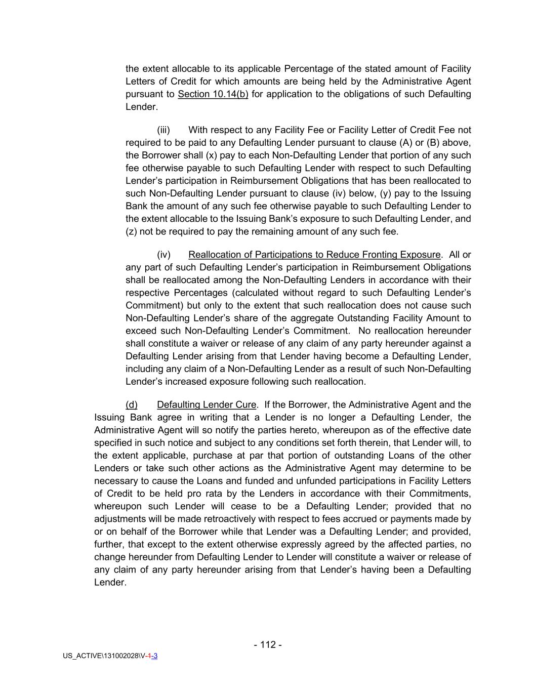 - 112 - US_ACTIVE\131002028\V-1-3 the extent allocable to its applicable Percentage of the stated amount of Facility Letters of Credit for which amounts are being held by the Administrative Agent pursuant to Section 10.14(b) for application to the obligations of such Defaulting Lender. (iii) With respect to any Facility Fee or Facility Letter of Credit Fee not required to be paid to any Defaulting Lender pursuant to clause (A) or (B) above, the Borrower shall (x) pay to each Non-Defaulting Lender that portion of any such fee otherwise payable to such Defaulting Lender with respect to such Defaulting Lender’s participation in Reimbursement Obligations that has been reallocated to such Non-Defaulting Lender pursuant to clause (iv) below, (y) pay to the Issuing Bank the amount of any such fee otherwise payable to such Defaulting Lender to the extent allocable to the Issuing Bank’s exposure to such Defaulting Lender, and (z) not be required to pay the remaining amount of any such fee. (iv) Reallocation of Participations to Reduce Fronting Exposure. All or any part of such Defaulting Lender’s participation in Reimbursement Obligations shall be reallocated among the Non-Defaulting Lenders in accordance with their respective Percentages (calculated without regard to such Defaulting Lender’s Commitment) but only to the extent that such reallocation does not cause such Non-Defaulting Lender’s share of the aggregate Outstanding Facility Amount to exceed such Non-Defaulting Lender’s Commitment. No reallocation hereunder shall constitute a waiver or release of any claim of any party hereunder against a Defaulting Lender arising from that Lender having become a Defaulting Lender, including any claim of a Non-Defaulting Lender as a result of such Non-Defaulting Lender’s increased exposure following such reallocation. (d) Defaulting Lender Cure. If the Borrower, the Administrative Agent and the Issuing Bank agree in writing that a Lender is no longer a Defaulting Lender, the Administrative Agent will so notify the parties hereto, whereupon as of the effective date specified in such notice and subject to any conditions set forth therein, that Lender will, to the extent applicable, purchase at par that portion of outstanding Loans of the other Lenders or take such other actions as the Administrative Agent may determine to be necessary to cause the Loans and funded and unfunded participations in Facility Letters of Credit to be held pro rata by the Lenders in accordance with their Commitments, whereupon such Lender will cease to be a Defaulting Lender; provided that no adjustments will be made retroactively with respect to fees accrued or payments made by or on behalf of the Borrower while that Lender was a Defaulting Lender; and provided, further, that except to the extent otherwise expressly agreed by the affected parties, no change hereunder from Defaulting Lender to Lender will constitute a waiver or release of any claim of any party hereunder arising from that Lender’s having been a Defaulting Lender.