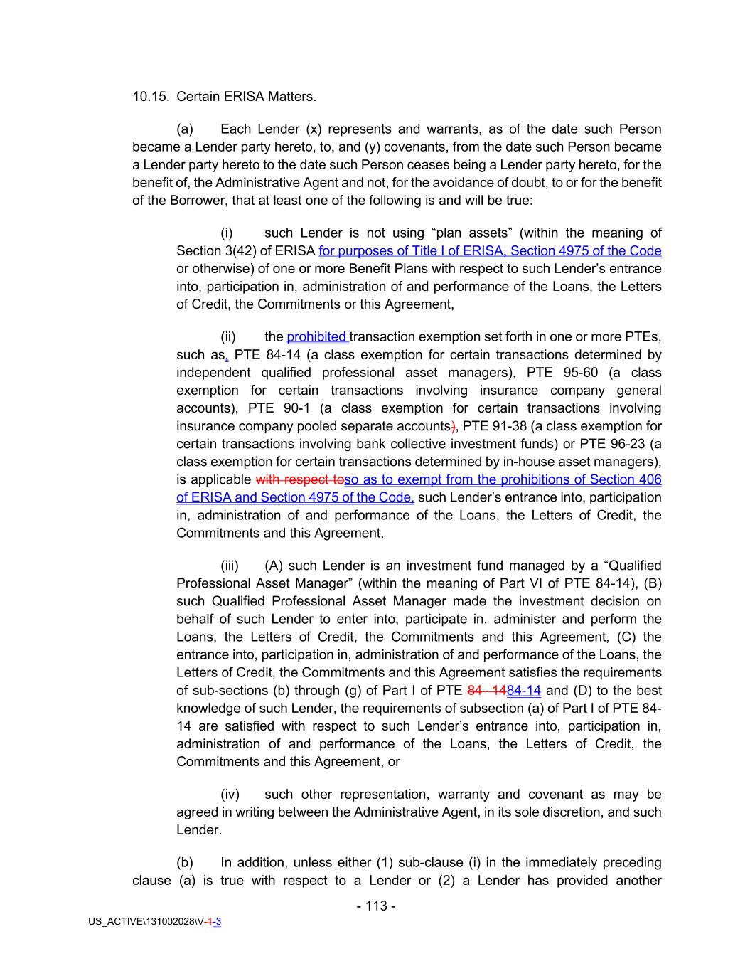 - 113 - US_ACTIVE\131002028\V-1-3 10.15. Certain ERISA Matters. (a) Each Lender (x) represents and warrants, as of the date such Person became a Lender party hereto, to, and (y) covenants, from the date such Person became a Lender party hereto to the date such Person ceases being a Lender party hereto, for the benefit of, the Administrative Agent and not, for the avoidance of doubt, to or for the benefit of the Borrower, that at least one of the following is and will be true: (i) such Lender is not using “plan assets” (within the meaning of Section 3(42) of ERISA for purposes of Title I of ERISA, Section 4975 of the Code or otherwise) of one or more Benefit Plans with respect to such Lender’s entrance into, participation in, administration of and performance of the Loans, the Letters of Credit, the Commitments or this Agreement, (ii) the prohibited transaction exemption set forth in one or more PTEs, such as, PTE 84-14 (a class exemption for certain transactions determined by independent qualified professional asset managers), PTE 95-60 (a class exemption for certain transactions involving insurance company general accounts), PTE 90-1 (a class exemption for certain transactions involving insurance company pooled separate accounts), PTE 91-38 (a class exemption for certain transactions involving bank collective investment funds) or PTE 96-23 (a class exemption for certain transactions determined by in-house asset managers), is applicable with respect toso as to exempt from the prohibitions of Section 406 of ERISA and Section 4975 of the Code, such Lender’s entrance into, participation in, administration of and performance of the Loans, the Letters of Credit, the Commitments and this Agreement, (iii) (A) such Lender is an investment fund managed by a “Qualified Professional Asset Manager” (within the meaning of Part VI of PTE 84-14), (B) such Qualified Professional Asset Manager made the investment decision on behalf of such Lender to enter into, participate in, administer and perform the Loans, the Letters of Credit, the Commitments and this Agreement, (C) the entrance into, participation in, administration of and performance of the Loans, the Letters of Credit, the Commitments and this Agreement satisfies the requirements of sub-sections (b) through (g) of Part I of PTE 84- 1484-14 and (D) to the best knowledge of such Lender, the requirements of subsection (a) of Part I of PTE 84- 14 are satisfied with respect to such Lender’s entrance into, participation in, administration of and performance of the Loans, the Letters of Credit, the Commitments and this Agreement, or (iv) such other representation, warranty and covenant as may be agreed in writing between the Administrative Agent, in its sole discretion, and such Lender. (b) In addition, unless either (1) sub-clause (i) in the immediately preceding clause (a) is true with respect to a Lender or (2) a Lender has provided another