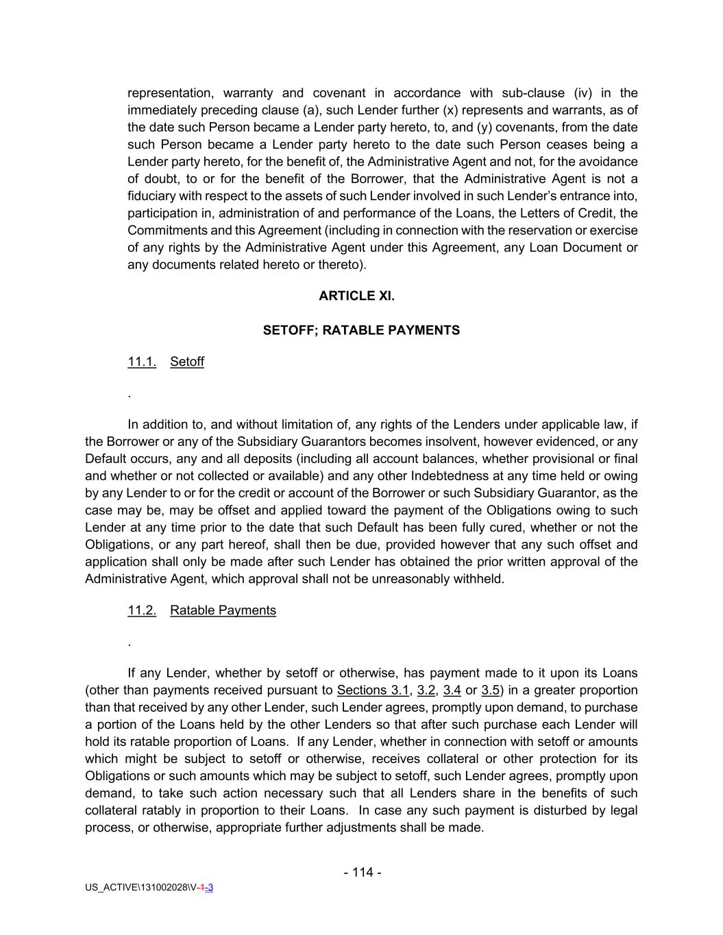 - 114 - US_ACTIVE\131002028\V-1-3 representation, warranty and covenant in accordance with sub-clause (iv) in the immediately preceding clause (a), such Lender further (x) represents and warrants, as of the date such Person became a Lender party hereto, to, and (y) covenants, from the date such Person became a Lender party hereto to the date such Person ceases being a Lender party hereto, for the benefit of, the Administrative Agent and not, for the avoidance of doubt, to or for the benefit of the Borrower, that the Administrative Agent is not a fiduciary with respect to the assets of such Lender involved in such Lender’s entrance into, participation in, administration of and performance of the Loans, the Letters of Credit, the Commitments and this Agreement (including in connection with the reservation or exercise of any rights by the Administrative Agent under this Agreement, any Loan Document or any documents related hereto or thereto). ARTICLE XI. SETOFF; RATABLE PAYMENTS 11.1. Setoff . In addition to, and without limitation of, any rights of the Lenders under applicable law, if the Borrower or any of the Subsidiary Guarantors becomes insolvent, however evidenced, or any Default occurs, any and all deposits (including all account balances, whether provisional or final and whether or not collected or available) and any other Indebtedness at any time held or owing by any Lender to or for the credit or account of the Borrower or such Subsidiary Guarantor, as the case may be, may be offset and applied toward the payment of the Obligations owing to such Lender at any time prior to the date that such Default has been fully cured, whether or not the Obligations, or any part hereof, shall then be due, provided however that any such offset and application shall only be made after such Lender has obtained the prior written approval of the Administrative Agent, which approval shall not be unreasonably withheld. 11.2. Ratable Payments . If any Lender, whether by setoff or otherwise, has payment made to it upon its Loans (other than payments received pursuant to Sections 3.1, 3.2, 3.4 or 3.5) in a greater proportion than that received by any other Lender, such Lender agrees, promptly upon demand, to purchase a portion of the Loans held by the other Lenders so that after such purchase each Lender will hold its ratable proportion of Loans. If any Lender, whether in connection with setoff or amounts which might be subject to setoff or otherwise, receives collateral or other protection for its Obligations or such amounts which may be subject to setoff, such Lender agrees, promptly upon demand, to take such action necessary such that all Lenders share in the benefits of such collateral ratably in proportion to their Loans. In case any such payment is disturbed by legal process, or otherwise, appropriate further adjustments shall be made.