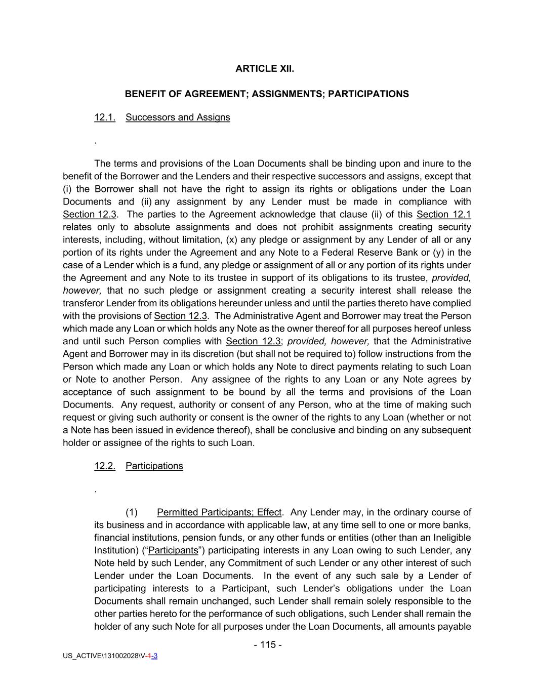 - 115 - US_ACTIVE\131002028\V-1-3 ARTICLE XII. BENEFIT OF AGREEMENT; ASSIGNMENTS; PARTICIPATIONS 12.1. Successors and Assigns . The terms and provisions of the Loan Documents shall be binding upon and inure to the benefit of the Borrower and the Lenders and their respective successors and assigns, except that (i) the Borrower shall not have the right to assign its rights or obligations under the Loan Documents and (ii) any assignment by any Lender must be made in compliance with Section 12.3. The parties to the Agreement acknowledge that clause (ii) of this Section 12.1 relates only to absolute assignments and does not prohibit assignments creating security interests, including, without limitation, (x) any pledge or assignment by any Lender of all or any portion of its rights under the Agreement and any Note to a Federal Reserve Bank or (y) in the case of a Lender which is a fund, any pledge or assignment of all or any portion of its rights under the Agreement and any Note to its trustee in support of its obligations to its trustee, provided, however, that no such pledge or assignment creating a security interest shall release the transferor Lender from its obligations hereunder unless and until the parties thereto have complied with the provisions of Section 12.3. The Administrative Agent and Borrower may treat the Person which made any Loan or which holds any Note as the owner thereof for all purposes hereof unless and until such Person complies with Section 12.3; provided, however, that the Administrative Agent and Borrower may in its discretion (but shall not be required to) follow instructions from the Person which made any Loan or which holds any Note to direct payments relating to such Loan or Note to another Person. Any assignee of the rights to any Loan or any Note agrees by acceptance of such assignment to be bound by all the terms and provisions of the Loan Documents. Any request, authority or consent of any Person, who at the time of making such request or giving such authority or consent is the owner of the rights to any Loan (whether or not a Note has been issued in evidence thereof), shall be conclusive and binding on any subsequent holder or assignee of the rights to such Loan. 12.2. Participations . (1) Permitted Participants; Effect. Any Lender may, in the ordinary course of its business and in accordance with applicable law, at any time sell to one or more banks, financial institutions, pension funds, or any other funds or entities (other than an Ineligible Institution) (“Participants”) participating interests in any Loan owing to such Lender, any Note held by such Lender, any Commitment of such Lender or any other interest of such Lender under the Loan Documents. In the event of any such sale by a Lender of participating interests to a Participant, such Lender’s obligations under the Loan Documents shall remain unchanged, such Lender shall remain solely responsible to the other parties hereto for the performance of such obligations, such Lender shall remain the holder of any such Note for all purposes under the Loan Documents, all amounts payable