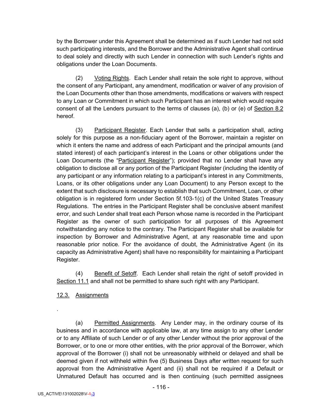 - 116 - US_ACTIVE\131002028\V-1-3 by the Borrower under this Agreement shall be determined as if such Lender had not sold such participating interests, and the Borrower and the Administrative Agent shall continue to deal solely and directly with such Lender in connection with such Lender’s rights and obligations under the Loan Documents. (2) Voting Rights. Each Lender shall retain the sole right to approve, without the consent of any Participant, any amendment, modification or waiver of any provision of the Loan Documents other than those amendments, modifications or waivers with respect to any Loan or Commitment in which such Participant has an interest which would require consent of all the Lenders pursuant to the terms of clauses (a), (b) or (e) of Section 8.2 hereof. (3) Participant Register. Each Lender that sells a participation shall, acting solely for this purpose as a non-fiduciary agent of the Borrower, maintain a register on which it enters the name and address of each Participant and the principal amounts (and stated interest) of each participant’s interest in the Loans or other obligations under the Loan Documents (the “Participant Register”); provided that no Lender shall have any obligation to disclose all or any portion of the Participant Register (including the identity of any participant or any information relating to a participant’s interest in any Commitments, Loans, or its other obligations under any Loan Document) to any Person except to the extent that such disclosure is necessary to establish that such Commitment, Loan, or other obligation is in registered form under Section 5f.103-1(c) of the United States Treasury Regulations. The entries in the Participant Register shall be conclusive absent manifest error, and such Lender shall treat each Person whose name is recorded in the Participant Register as the owner of such participation for all purposes of this Agreement notwithstanding any notice to the contrary. The Participant Register shall be available for inspection by Borrower and Administrative Agent, at any reasonable time and upon reasonable prior notice. For the avoidance of doubt, the Administrative Agent (in its capacity as Administrative Agent) shall have no responsibility for maintaining a Participant Register. (4) Benefit of Setoff. Each Lender shall retain the right of setoff provided in Section 11.1 and shall not be permitted to share such right with any Participant. 12.3. Assignments . (a) Permitted Assignments. Any Lender may, in the ordinary course of its business and in accordance with applicable law, at any time assign to any other Lender or to any Affiliate of such Lender or of any other Lender without the prior approval of the Borrower, or to one or more other entities, with the prior approval of the Borrower, which approval of the Borrower (i) shall not be unreasonably withheld or delayed and shall be deemed given if not withheld within five (5) Business Days after written request for such approval from the Administrative Agent and (ii) shall not be required if a Default or Unmatured Default has occurred and is then continuing (such permitted assignees