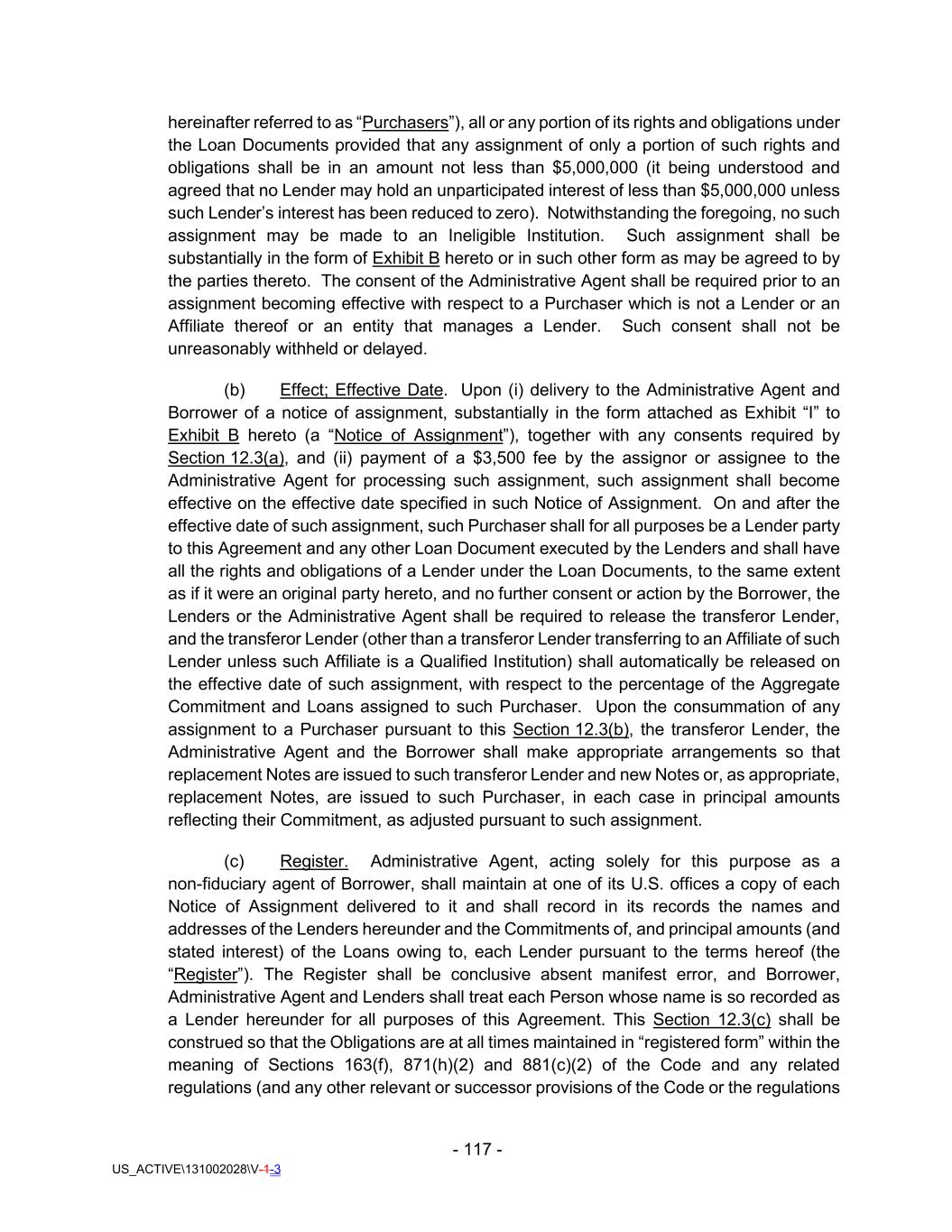 - 117 - US_ACTIVE\131002028\V-1-3 hereinafter referred to as “Purchasers”), all or any portion of its rights and obligations under the Loan Documents provided that any assignment of only a portion of such rights and obligations shall be in an amount not less than $5,000,000 (it being understood and agreed that no Lender may hold an unparticipated interest of less than $5,000,000 unless such Lender’s interest has been reduced to zero). Notwithstanding the foregoing, no such assignment may be made to an Ineligible Institution. Such assignment shall be substantially in the form of Exhibit B hereto or in such other form as may be agreed to by the parties thereto. The consent of the Administrative Agent shall be required prior to an assignment becoming effective with respect to a Purchaser which is not a Lender or an Affiliate thereof or an entity that manages a Lender. Such consent shall not be unreasonably withheld or delayed. (b) Effect; Effective Date. Upon (i) delivery to the Administrative Agent and Borrower of a notice of assignment, substantially in the form attached as Exhibit “I” to Exhibit B hereto (a “Notice of Assignment”), together with any consents required by Section 12.3(a), and (ii) payment of a $3,500 fee by the assignor or assignee to the Administrative Agent for processing such assignment, such assignment shall become effective on the effective date specified in such Notice of Assignment. On and after the effective date of such assignment, such Purchaser shall for all purposes be a Lender party to this Agreement and any other Loan Document executed by the Lenders and shall have all the rights and obligations of a Lender under the Loan Documents, to the same extent as if it were an original party hereto, and no further consent or action by the Borrower, the Lenders or the Administrative Agent shall be required to release the transferor Lender, and the transferor Lender (other than a transferor Lender transferring to an Affiliate of such Lender unless such Affiliate is a Qualified Institution) shall automatically be released on the effective date of such assignment, with respect to the percentage of the Aggregate Commitment and Loans assigned to such Purchaser. Upon the consummation of any assignment to a Purchaser pursuant to this Section 12.3(b), the transferor Lender, the Administrative Agent and the Borrower shall make appropriate arrangements so that replacement Notes are issued to such transferor Lender and new Notes or, as appropriate, replacement Notes, are issued to such Purchaser, in each case in principal amounts reflecting their Commitment, as adjusted pursuant to such assignment. (c) Register. Administrative Agent, acting solely for this purpose as a non-fiduciary agent of Borrower, shall maintain at one of its U.S. offices a copy of each Notice of Assignment delivered to it and shall record in its records the names and addresses of the Lenders hereunder and the Commitments of, and principal amounts (and stated interest) of the Loans owing to, each Lender pursuant to the terms hereof (the “Register”). The Register shall be conclusive absent manifest error, and Borrower, Administrative Agent and Lenders shall treat each Person whose name is so recorded as a Lender hereunder for all purposes of this Agreement. This Section 12.3(c) shall be construed so that the Obligations are at all times maintained in “registered form” within the meaning of Sections 163(f), 871(h)(2) and 881(c)(2) of the Code and any related regulations (and any other relevant or successor provisions of the Code or the regulations
