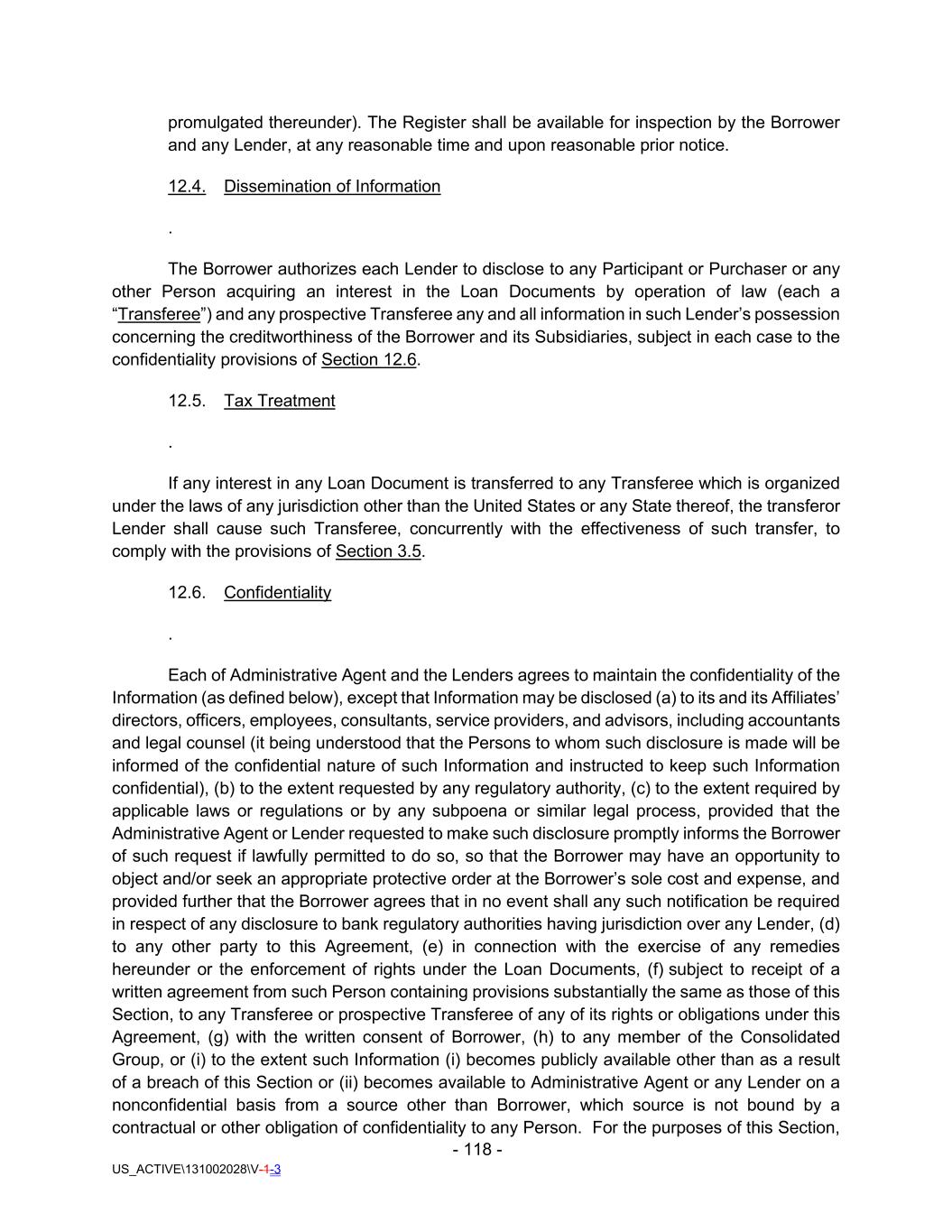 - 118 - US_ACTIVE\131002028\V-1-3 promulgated thereunder). The Register shall be available for inspection by the Borrower and any Lender, at any reasonable time and upon reasonable prior notice. 12.4. Dissemination of Information . The Borrower authorizes each Lender to disclose to any Participant or Purchaser or any other Person acquiring an interest in the Loan Documents by operation of law (each a “Transferee”) and any prospective Transferee any and all information in such Lender’s possession concerning the creditworthiness of the Borrower and its Subsidiaries, subject in each case to the confidentiality provisions of Section 12.6. 12.5. Tax Treatment . If any interest in any Loan Document is transferred to any Transferee which is organized under the laws of any jurisdiction other than the United States or any State thereof, the transferor Lender shall cause such Transferee, concurrently with the effectiveness of such transfer, to comply with the provisions of Section 3.5. 12.6. Confidentiality . Each of Administrative Agent and the Lenders agrees to maintain the confidentiality of the Information (as defined below), except that Information may be disclosed (a) to its and its Affiliates’ directors, officers, employees, consultants, service providers, and advisors, including accountants and legal counsel (it being understood that the Persons to whom such disclosure is made will be informed of the confidential nature of such Information and instructed to keep such Information confidential), (b) to the extent requested by any regulatory authority, (c) to the extent required by applicable laws or regulations or by any subpoena or similar legal process, provided that the Administrative Agent or Lender requested to make such disclosure promptly informs the Borrower of such request if lawfully permitted to do so, so that the Borrower may have an opportunity to object and/or seek an appropriate protective order at the Borrower’s sole cost and expense, and provided further that the Borrower agrees that in no event shall any such notification be required in respect of any disclosure to bank regulatory authorities having jurisdiction over any Lender, (d) to any other party to this Agreement, (e) in connection with the exercise of any remedies hereunder or the enforcement of rights under the Loan Documents, (f) subject to receipt of a written agreement from such Person containing provisions substantially the same as those of this Section, to any Transferee or prospective Transferee of any of its rights or obligations under this Agreement, (g) with the written consent of Borrower, (h) to any member of the Consolidated Group, or (i) to the extent such Information (i) becomes publicly available other than as a result of a breach of this Section or (ii) becomes available to Administrative Agent or any Lender on a nonconfidential basis from a source other than Borrower, which source is not bound by a contractual or other obligation of confidentiality to any Person. For the purposes of this Section,