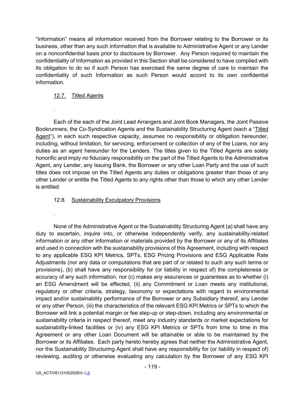 - 119 - US_ACTIVE\131002028\V-1-3 “Information” means all information received from the Borrower relating to the Borrower or its business, other than any such information that is available to Administrative Agent or any Lender on a nonconfidential basis prior to disclosure by Borrower. Any Person required to maintain the confidentiality of Information as provided in this Section shall be considered to have complied with its obligation to do so if such Person has exercised the same degree of care to maintain the confidentiality of such Information as such Person would accord to its own confidential information. 12.7. Titled Agents . Each of the each of the Joint Lead Arrangers and Joint Book Managers, the Joint Passive Bookrunners, the Co-Syndication Agents and the Sustainability Structuring Agent (each a “Titled Agent”), in each such respective capacity, assumes no responsibility or obligation hereunder, including, without limitation, for servicing, enforcement or collection of any of the Loans, nor any duties as an agent hereunder for the Lenders. The titles given to the Titled Agents are solely honorific and imply no fiduciary responsibility on the part of the Titled Agents to the Administrative Agent, any Lender, any Issuing Bank, the Borrower or any other Loan Party and the use of such titles does not impose on the Titled Agents any duties or obligations greater than those of any other Lender or entitle the Titled Agents to any rights other than those to which any other Lender is entitled. 12.8. Sustainability Exculpatory Provisions . None of the Administrative Agent or the Sustainability Structuring Agent (a) shall have any duty to ascertain, inquire into, or otherwise independently verify, any sustainability-related information or any other information or materials provided by the Borrower or any of its Affiliates and used in connection with the sustainability provisions of this Agreement, including with respect to any applicable ESG KPI Metrics, SPTs, ESG Pricing Provisions and ESG Applicable Rate Adjustments (nor any data or computations that are part of or related to such any such terms or provisions), (b) shall have any responsibility for (or liability in respect of) the completeness or accuracy of any such information, nor (c) makes any assurances or guarantees as to whether (i) an ESG Amendment will be effected, (ii) any Commitment or Loan meets any institutional, regulatory or other criteria, strategy, taxonomy or expectations with regard to environmental impact and/or sustainability performance of the Borrower or any Subsidiary thereof, any Lender or any other Person, (iii) the characteristics of the relevant ESG KPI Metrics or SPTs to which the Borrower will link a potential margin or fee step-up or step-down, including any environmental or sustainability criteria in respect thereof, meet any industry standards or market expectations for sustainability-linked facilities or (iv) any ESG KPI Metrics or SPTs from time to time in this Agreement or any other Loan Document will be attainable or able to be maintained by the Borrower or its Affiliates. Each party hereto hereby agrees that neither the Administrative Agent, nor the Sustainability Structuring Agent shall have any responsibility for (or liability in respect of) reviewing, auditing or otherwise evaluating any calculation by the Borrower of any ESG KPI
