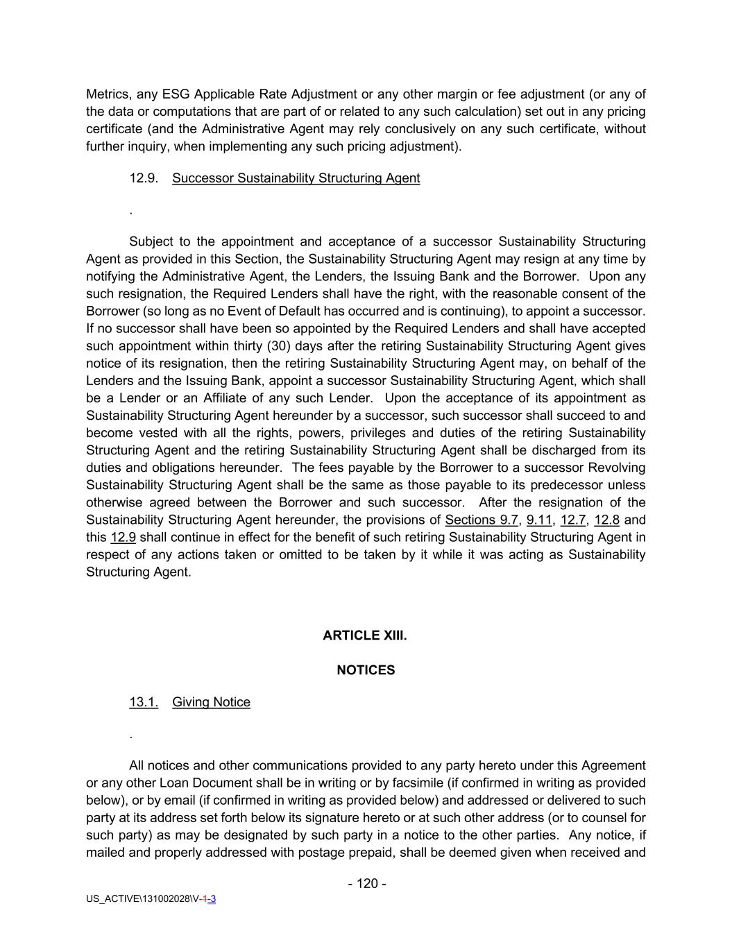 - 120 - US_ACTIVE\131002028\V-1-3 Metrics, any ESG Applicable Rate Adjustment or any other margin or fee adjustment (or any of the data or computations that are part of or related to any such calculation) set out in any pricing certificate (and the Administrative Agent may rely conclusively on any such certificate, without further inquiry, when implementing any such pricing adjustment). 12.9. Successor Sustainability Structuring Agent . Subject to the appointment and acceptance of a successor Sustainability Structuring Agent as provided in this Section, the Sustainability Structuring Agent may resign at any time by notifying the Administrative Agent, the Lenders, the Issuing Bank and the Borrower. Upon any such resignation, the Required Lenders shall have the right, with the reasonable consent of the Borrower (so long as no Event of Default has occurred and is continuing), to appoint a successor. If no successor shall have been so appointed by the Required Lenders and shall have accepted such appointment within thirty (30) days after the retiring Sustainability Structuring Agent gives notice of its resignation, then the retiring Sustainability Structuring Agent may, on behalf of the Lenders and the Issuing Bank, appoint a successor Sustainability Structuring Agent, which shall be a Lender or an Affiliate of any such Lender. Upon the acceptance of its appointment as Sustainability Structuring Agent hereunder by a successor, such successor shall succeed to and become vested with all the rights, powers, privileges and duties of the retiring Sustainability Structuring Agent and the retiring Sustainability Structuring Agent shall be discharged from its duties and obligations hereunder. The fees payable by the Borrower to a successor Revolving Sustainability Structuring Agent shall be the same as those payable to its predecessor unless otherwise agreed between the Borrower and such successor. After the resignation of the Sustainability Structuring Agent hereunder, the provisions of Sections 9.7, 9.11, 12.7, 12.8 and this 12.9 shall continue in effect for the benefit of such retiring Sustainability Structuring Agent in respect of any actions taken or omitted to be taken by it while it was acting as Sustainability Structuring Agent. ARTICLE XIII. NOTICES 13.1. Giving Notice . All notices and other communications provided to any party hereto under this Agreement or any other Loan Document shall be in writing or by facsimile (if confirmed in writing as provided below), or by email (if confirmed in writing as provided below) and addressed or delivered to such party at its address set forth below its signature hereto or at such other address (or to counsel for such party) as may be designated by such party in a notice to the other parties. Any notice, if mailed and properly addressed with postage prepaid, shall be deemed given when received and