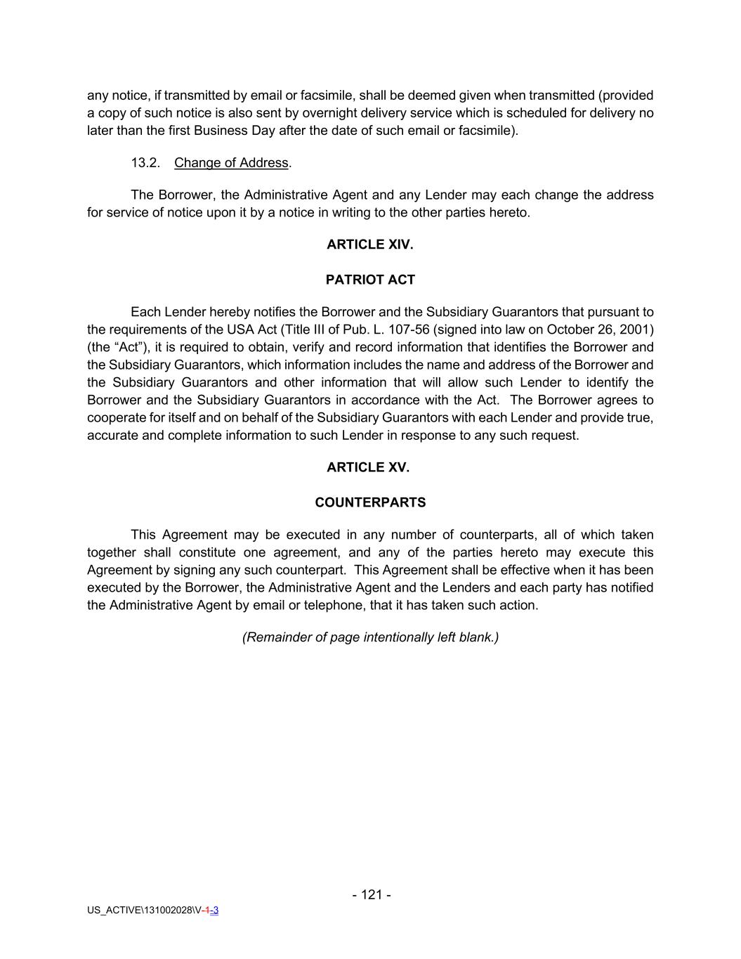 - 121 - US_ACTIVE\131002028\V-1-3 any notice, if transmitted by email or facsimile, shall be deemed given when transmitted (provided a copy of such notice is also sent by overnight delivery service which is scheduled for delivery no later than the first Business Day after the date of such email or facsimile). 13.2. Change of Address. The Borrower, the Administrative Agent and any Lender may each change the address for service of notice upon it by a notice in writing to the other parties hereto. ARTICLE XIV. PATRIOT ACT Each Lender hereby notifies the Borrower and the Subsidiary Guarantors that pursuant to the requirements of the USA Act (Title III of Pub. L. 107-56 (signed into law on October 26, 2001) (the “Act”), it is required to obtain, verify and record information that identifies the Borrower and the Subsidiary Guarantors, which information includes the name and address of the Borrower and the Subsidiary Guarantors and other information that will allow such Lender to identify the Borrower and the Subsidiary Guarantors in accordance with the Act. The Borrower agrees to cooperate for itself and on behalf of the Subsidiary Guarantors with each Lender and provide true, accurate and complete information to such Lender in response to any such request. ARTICLE XV. COUNTERPARTS This Agreement may be executed in any number of counterparts, all of which taken together shall constitute one agreement, and any of the parties hereto may execute this Agreement by signing any such counterpart. This Agreement shall be effective when it has been executed by the Borrower, the Administrative Agent and the Lenders and each party has notified the Administrative Agent by email or telephone, that it has taken such action. (Remainder of page intentionally left blank.)