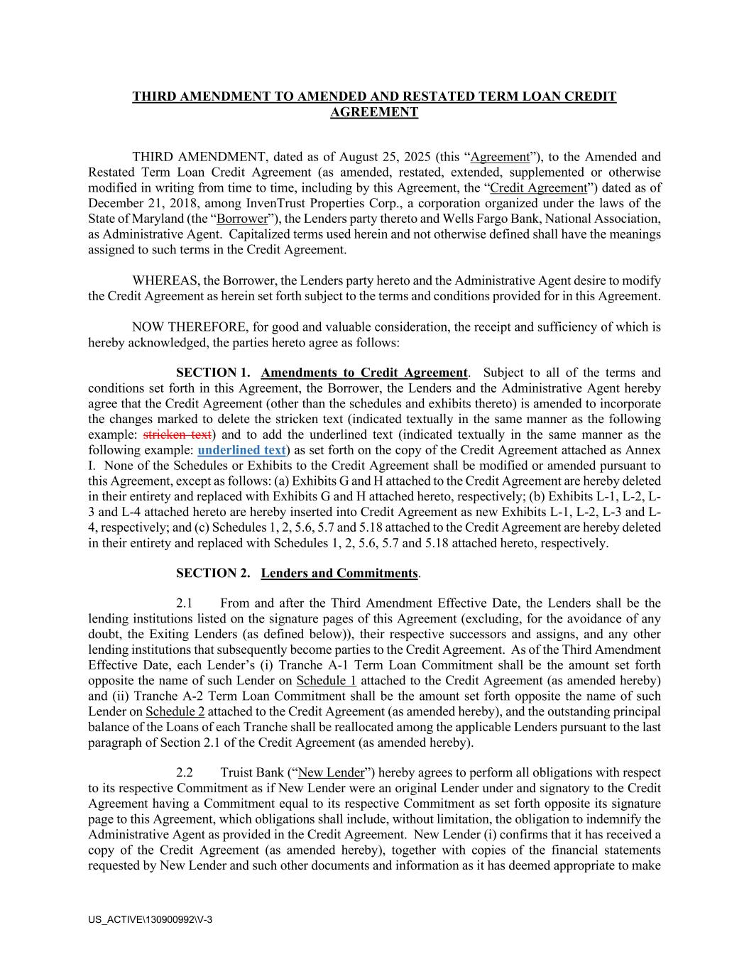 US_ACTIVE\130900992\V-3 THIRD AMENDMENT TO AMENDED AND RESTATED TERM LOAN CREDIT AGREEMENT THIRD AMENDMENT, dated as of August 25, 2025 (this “Agreement”), to the Amended and Restated Term Loan Credit Agreement (as amended, restated, extended, supplemented or otherwise modified in writing from time to time, including by this Agreement, the “Credit Agreement”) dated as of December 21, 2018, among InvenTrust Properties Corp., a corporation organized under the laws of the State of Maryland (the “Borrower”), the Lenders party thereto and Wells Fargo Bank, National Association, as Administrative Agent. Capitalized terms used herein and not otherwise defined shall have the meanings assigned to such terms in the Credit Agreement. WHEREAS, the Borrower, the Lenders party hereto and the Administrative Agent desire to modify the Credit Agreement as herein set forth subject to the terms and conditions provided for in this Agreement. NOW THEREFORE, for good and valuable consideration, the receipt and sufficiency of which is hereby acknowledged, the parties hereto agree as follows: SECTION 1. Amendments to Credit Agreement. Subject to all of the terms and conditions set forth in this Agreement, the Borrower, the Lenders and the Administrative Agent hereby agree that the Credit Agreement (other than the schedules and exhibits thereto) is amended to incorporate the changes marked to delete the stricken text (indicated textually in the same manner as the following example: stricken text) and to add the underlined text (indicated textually in the same manner as the following example: underlined text) as set forth on the copy of the Credit Agreement attached as Annex I. None of the Schedules or Exhibits to the Credit Agreement shall be modified or amended pursuant to this Agreement, except as follows: (a) Exhibits G and H attached to the Credit Agreement are hereby deleted in their entirety and replaced with Exhibits G and H attached hereto, respectively; (b) Exhibits L-1, L-2, L- 3 and L-4 attached hereto are hereby inserted into Credit Agreement as new Exhibits L-1, L-2, L-3 and L- 4, respectively; and (c) Schedules 1, 2, 5.6, 5.7 and 5.18 attached to the Credit Agreement are hereby deleted in their entirety and replaced with Schedules 1, 2, 5.6, 5.7 and 5.18 attached hereto, respectively. SECTION 2. Lenders and Commitments. 2.1 From and after the Third Amendment Effective Date, the Lenders shall be the lending institutions listed on the signature pages of this Agreement (excluding, for the avoidance of any doubt, the Exiting Lenders (as defined below)), their respective successors and assigns, and any other lending institutions that subsequently become parties to the Credit Agreement. As of the Third Amendment Effective Date, each Lender’s (i) Tranche A-1 Term Loan Commitment shall be the amount set forth opposite the name of such Lender on Schedule 1 attached to the Credit Agreement (as amended hereby) and (ii) Tranche A-2 Term Loan Commitment shall be the amount set forth opposite the name of such Lender on Schedule 2 attached to the Credit Agreement (as amended hereby), and the outstanding principal balance of the Loans of each Tranche shall be reallocated among the applicable Lenders pursuant to the last paragraph of Section 2.1 of the Credit Agreement (as amended hereby). 2.2 Truist Bank (“New Lender”) hereby agrees to perform all obligations with respect to its respective Commitment as if New Lender were an original Lender under and signatory to the Credit Agreement having a Commitment equal to its respective Commitment as set forth opposite its signature page to this Agreement, which obligations shall include, without limitation, the obligation to indemnify the Administrative Agent as provided in the Credit Agreement. New Lender (i) confirms that it has received a copy of the Credit Agreement (as amended hereby), together with copies of the financial statements requested by New Lender and such other documents and information as it has deemed appropriate to make