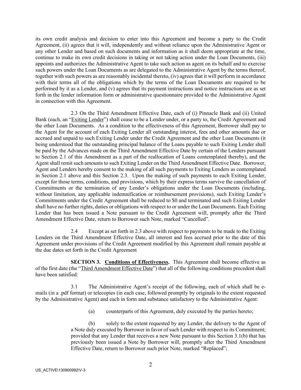 2 US_ACTIVE\130900992\V-3 its own credit analysis and decision to enter into this Agreement and become a party to the Credit Agreement, (ii) agrees that it will, independently and without reliance upon the Administrative Agent or any other Lender and based on such documents and information as it shall deem appropriate at the time, continue to make its own credit decisions in taking or not taking action under the Loan Documents, (iii) appoints and authorizes the Administrative Agent to take such action as agent on its behalf and to exercise such powers under the Loan Documents as are delegated to the Administrative Agent by the terms thereof, together with such powers as are reasonably incidental thereto, (iv) agrees that it will perform in accordance with their terms all of the obligations which by the terms of the Loan Documents are required to be performed by it as a Lender, and (v) agrees that its payment instructions and notice instructions are as set forth in the lender information form or administrative questionnaire provided to the Administrative Agent in connection with this Agreement. 2.3 On the Third Amendment Effective Date, each of (i) Pinnacle Bank and (ii) United Bank (each, an “Exiting Lender”) shall cease to be a Lender under, or a party to, the Credit Agreement and the other Loan Documents. As a condition to the effectiveness of this Agreement, Borrower shall pay to the Agent for the account of each Exiting Lender all outstanding interest, fees and other amounts due or accrued and unpaid to such Exiting Lender under the Credit Agreement and the other Loan Documents (it being understood that the outstanding principal balance of the Loans payable to such Exiting Lender shall be paid by the Advances made on the Third Amendment Effective Date by certain of the Lenders pursuant to Section 2.1 of this Amendment as a part of the reallocation of Loans contemplated thereby), and the Agent shall remit such amounts to such Exiting Lender on the Third Amendment Effective Date. Borrower, Agent and Lenders hereby consent to the making of all such payments to Exiting Lenders as contemplated in Section 2.1 above and this Section 2.3. Upon the making of such payments to each Exiting Lender, except for those terms, conditions, and provisions, which by their express terms survive the cancellation of Commitments or the termination of any Lender’s obligations under the Loan Documents (including, without limitation, any applicable indemnification or reimbursement provisions), such Exiting Lender’s Commitments under the Credit Agreement shall be reduced to $0 and terminated and such Exiting Lender shall have no further rights, duties or obligations with respect to or under the Loan Documents. Each Exiting Lender that has been issued a Note pursuant to the Credit Agreement will, promptly after the Third Amendment Effective Date, return to Borrower such Note, marked “Cancelled”. 2.4 Except as set forth in 2.3 above with respect to payments to be made to the Exiting Lenders on the Third Amendment Effective Date, all interest and fees accrued prior to the date of this Agreement under provisions of the Credit Agreement modified by this Agreement shall remain payable at the due dates set forth in the Credit Agreement SECTION 3. Conditions of Effectiveness. This Agreement shall become effective as of the first date (the “Third Amendment Effective Date”) that all of the following conditions precedent shall have been satisfied: 3.1 The Administrative Agent’s receipt of the following, each of which shall be e- mails (in a .pdf format) or telecopies (in each case, followed promptly by originals to the extent requested by the Administrative Agent) and each in form and substance satisfactory to the Administrative Agent: (a) counterparts of this Agreement, duly executed by the parties hereto; (b) solely to the extent requested by any Lender, the delivery to the Agent of a Note duly executed by Borrower in favor of such Lender with respect to its Commitment; provided that any Lender that receives a new Note pursuant to this Section 3.1(b) that has previously been issued a Note by Borrower will, promptly after the Third Amendment Effective Date, return to Borrower such prior Note, marked “Replaced”;