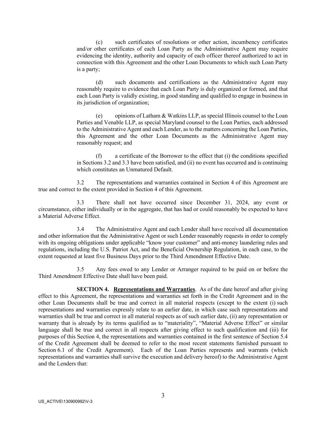 3 US_ACTIVE\130900992\V-3 (c) such certificates of resolutions or other action, incumbency certificates and/or other certificates of each Loan Party as the Administrative Agent may require evidencing the identity, authority and capacity of each officer thereof authorized to act in connection with this Agreement and the other Loan Documents to which such Loan Party is a party; (d) such documents and certifications as the Administrative Agent may reasonably require to evidence that each Loan Party is duly organized or formed, and that each Loan Party is validly existing, in good standing and qualified to engage in business in its jurisdiction of organization; (e) opinions of Latham & Watkins LLP, as special Illinois counsel to the Loan Parties and Venable LLP, as special Maryland counsel to the Loan Parties, each addressed to the Administrative Agent and each Lender, as to the matters concerning the Loan Parties, this Agreement and the other Loan Documents as the Administrative Agent may reasonably request; and (f) a certificate of the Borrower to the effect that (i) the conditions specified in Sections 3.2 and 3.3 have been satisfied, and (ii) no event has occurred and is continuing which constitutes an Unmatured Default. 3.2 The representations and warranties contained in Section 4 of this Agreement are true and correct to the extent provided in Section 4 of this Agreement. 3.3 There shall not have occurred since December 31, 2024, any event or circumstance, either individually or in the aggregate, that has had or could reasonably be expected to have a Material Adverse Effect. 3.4 The Administrative Agent and each Lender shall have received all documentation and other information that the Administrative Agent or such Lender reasonably requests in order to comply with its ongoing obligations under applicable “know your customer” and anti-money laundering rules and regulations, including the U.S. Patriot Act, and the Beneficial Ownership Regulation, in each case, to the extent requested at least five Business Days prior to the Third Amendment Effective Date. 3.5 Any fees owed to any Lender or Arranger required to be paid on or before the Third Amendment Effective Date shall have been paid. SECTION 4. Representations and Warranties. As of the date hereof and after giving effect to this Agreement, the representations and warranties set forth in the Credit Agreement and in the other Loan Documents shall be true and correct in all material respects (except to the extent (i) such representations and warranties expressly relate to an earlier date, in which case such representations and warranties shall be true and correct in all material respects as of such earlier date, (ii) any representation or warranty that is already by its terms qualified as to “materiality”, “Material Adverse Effect” or similar language shall be true and correct in all respects after giving effect to such qualification and (iii) for purposes of this Section 4, the representations and warranties contained in the first sentence of Section 5.4 of the Credit Agreement shall be deemed to refer to the most recent statements furnished pursuant to Section 6.1 of the Credit Agreement). Each of the Loan Parties represents and warrants (which representations and warranties shall survive the execution and delivery hereof) to the Administrative Agent and the Lenders that: