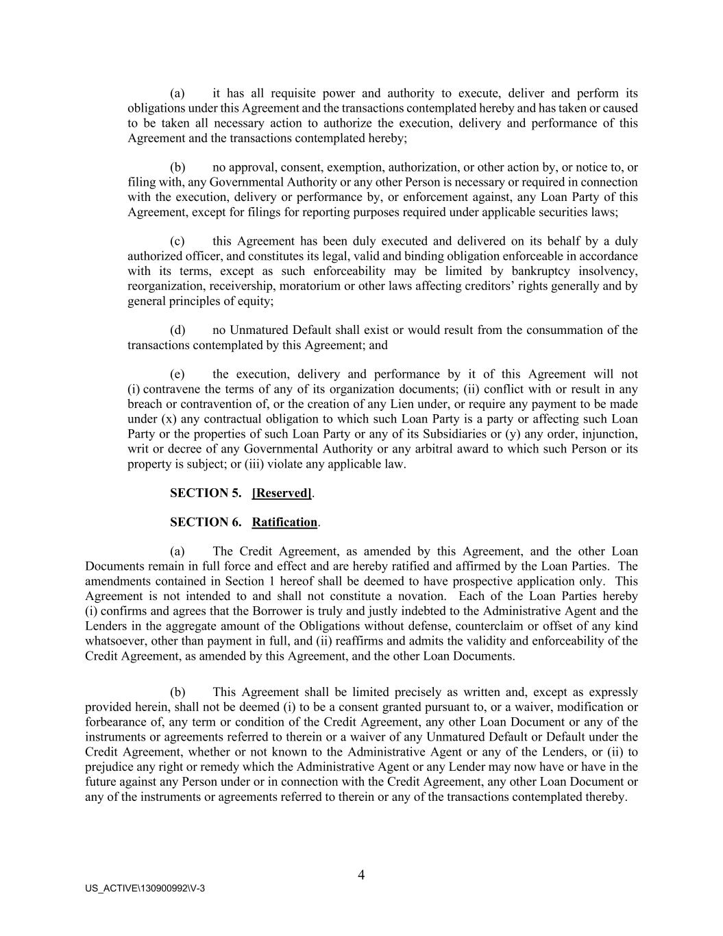 4 US_ACTIVE\130900992\V-3 (a) it has all requisite power and authority to execute, deliver and perform its obligations under this Agreement and the transactions contemplated hereby and has taken or caused to be taken all necessary action to authorize the execution, delivery and performance of this Agreement and the transactions contemplated hereby; (b) no approval, consent, exemption, authorization, or other action by, or notice to, or filing with, any Governmental Authority or any other Person is necessary or required in connection with the execution, delivery or performance by, or enforcement against, any Loan Party of this Agreement, except for filings for reporting purposes required under applicable securities laws; (c) this Agreement has been duly executed and delivered on its behalf by a duly authorized officer, and constitutes its legal, valid and binding obligation enforceable in accordance with its terms, except as such enforceability may be limited by bankruptcy insolvency, reorganization, receivership, moratorium or other laws affecting creditors’ rights generally and by general principles of equity; (d) no Unmatured Default shall exist or would result from the consummation of the transactions contemplated by this Agreement; and (e) the execution, delivery and performance by it of this Agreement will not (i) contravene the terms of any of its organization documents; (ii) conflict with or result in any breach or contravention of, or the creation of any Lien under, or require any payment to be made under (x) any contractual obligation to which such Loan Party is a party or affecting such Loan Party or the properties of such Loan Party or any of its Subsidiaries or (y) any order, injunction, writ or decree of any Governmental Authority or any arbitral award to which such Person or its property is subject; or (iii) violate any applicable law. SECTION 5. [Reserved]. SECTION 6. Ratification. (a) The Credit Agreement, as amended by this Agreement, and the other Loan Documents remain in full force and effect and are hereby ratified and affirmed by the Loan Parties. The amendments contained in Section 1 hereof shall be deemed to have prospective application only. This Agreement is not intended to and shall not constitute a novation. Each of the Loan Parties hereby (i) confirms and agrees that the Borrower is truly and justly indebted to the Administrative Agent and the Lenders in the aggregate amount of the Obligations without defense, counterclaim or offset of any kind whatsoever, other than payment in full, and (ii) reaffirms and admits the validity and enforceability of the Credit Agreement, as amended by this Agreement, and the other Loan Documents. (b) This Agreement shall be limited precisely as written and, except as expressly provided herein, shall not be deemed (i) to be a consent granted pursuant to, or a waiver, modification or forbearance of, any term or condition of the Credit Agreement, any other Loan Document or any of the instruments or agreements referred to therein or a waiver of any Unmatured Default or Default under the Credit Agreement, whether or not known to the Administrative Agent or any of the Lenders, or (ii) to prejudice any right or remedy which the Administrative Agent or any Lender may now have or have in the future against any Person under or in connection with the Credit Agreement, any other Loan Document or any of the instruments or agreements referred to therein or any of the transactions contemplated thereby.