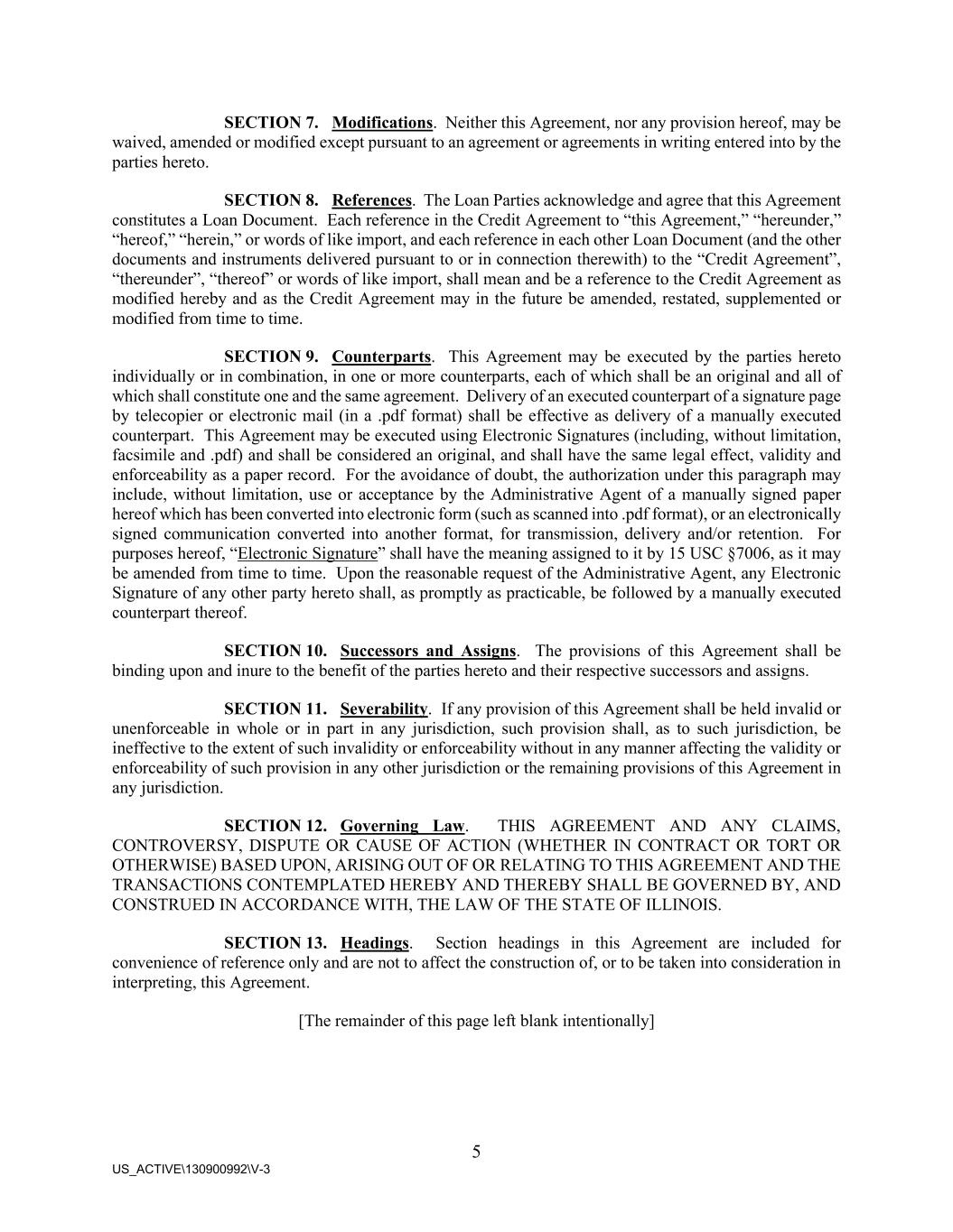 5 US_ACTIVE\130900992\V-3 SECTION 7. Modifications. Neither this Agreement, nor any provision hereof, may be waived, amended or modified except pursuant to an agreement or agreements in writing entered into by the parties hereto. SECTION 8. References. The Loan Parties acknowledge and agree that this Agreement constitutes a Loan Document. Each reference in the Credit Agreement to “this Agreement,” “hereunder,” “hereof,” “herein,” or words of like import, and each reference in each other Loan Document (and the other documents and instruments delivered pursuant to or in connection therewith) to the “Credit Agreement”, “thereunder”, “thereof” or words of like import, shall mean and be a reference to the Credit Agreement as modified hereby and as the Credit Agreement may in the future be amended, restated, supplemented or modified from time to time. SECTION 9. Counterparts. This Agreement may be executed by the parties hereto individually or in combination, in one or more counterparts, each of which shall be an original and all of which shall constitute one and the same agreement. Delivery of an executed counterpart of a signature page by telecopier or electronic mail (in a .pdf format) shall be effective as delivery of a manually executed counterpart. This Agreement may be executed using Electronic Signatures (including, without limitation, facsimile and .pdf) and shall be considered an original, and shall have the same legal effect, validity and enforceability as a paper record. For the avoidance of doubt, the authorization under this paragraph may include, without limitation, use or acceptance by the Administrative Agent of a manually signed paper hereof which has been converted into electronic form (such as scanned into .pdf format), or an electronically signed communication converted into another format, for transmission, delivery and/or retention. For purposes hereof, “Electronic Signature” shall have the meaning assigned to it by 15 USC §7006, as it may be amended from time to time. Upon the reasonable request of the Administrative Agent, any Electronic Signature of any other party hereto shall, as promptly as practicable, be followed by a manually executed counterpart thereof. SECTION 10. Successors and Assigns. The provisions of this Agreement shall be binding upon and inure to the benefit of the parties hereto and their respective successors and assigns. SECTION 11. Severability. If any provision of this Agreement shall be held invalid or unenforceable in whole or in part in any jurisdiction, such provision shall, as to such jurisdiction, be ineffective to the extent of such invalidity or enforceability without in any manner affecting the validity or enforceability of such provision in any other jurisdiction or the remaining provisions of this Agreement in any jurisdiction. SECTION 12. Governing Law. THIS AGREEMENT AND ANY CLAIMS, CONTROVERSY, DISPUTE OR CAUSE OF ACTION (WHETHER IN CONTRACT OR TORT OR OTHERWISE) BASED UPON, ARISING OUT OF OR RELATING TO THIS AGREEMENT AND THE TRANSACTIONS CONTEMPLATED HEREBY AND THEREBY SHALL BE GOVERNED BY, AND CONSTRUED IN ACCORDANCE WITH, THE LAW OF THE STATE OF ILLINOIS. SECTION 13. Headings. Section headings in this Agreement are included for convenience of reference only and are not to affect the construction of, or to be taken into consideration in interpreting, this Agreement. [The remainder of this page left blank intentionally]