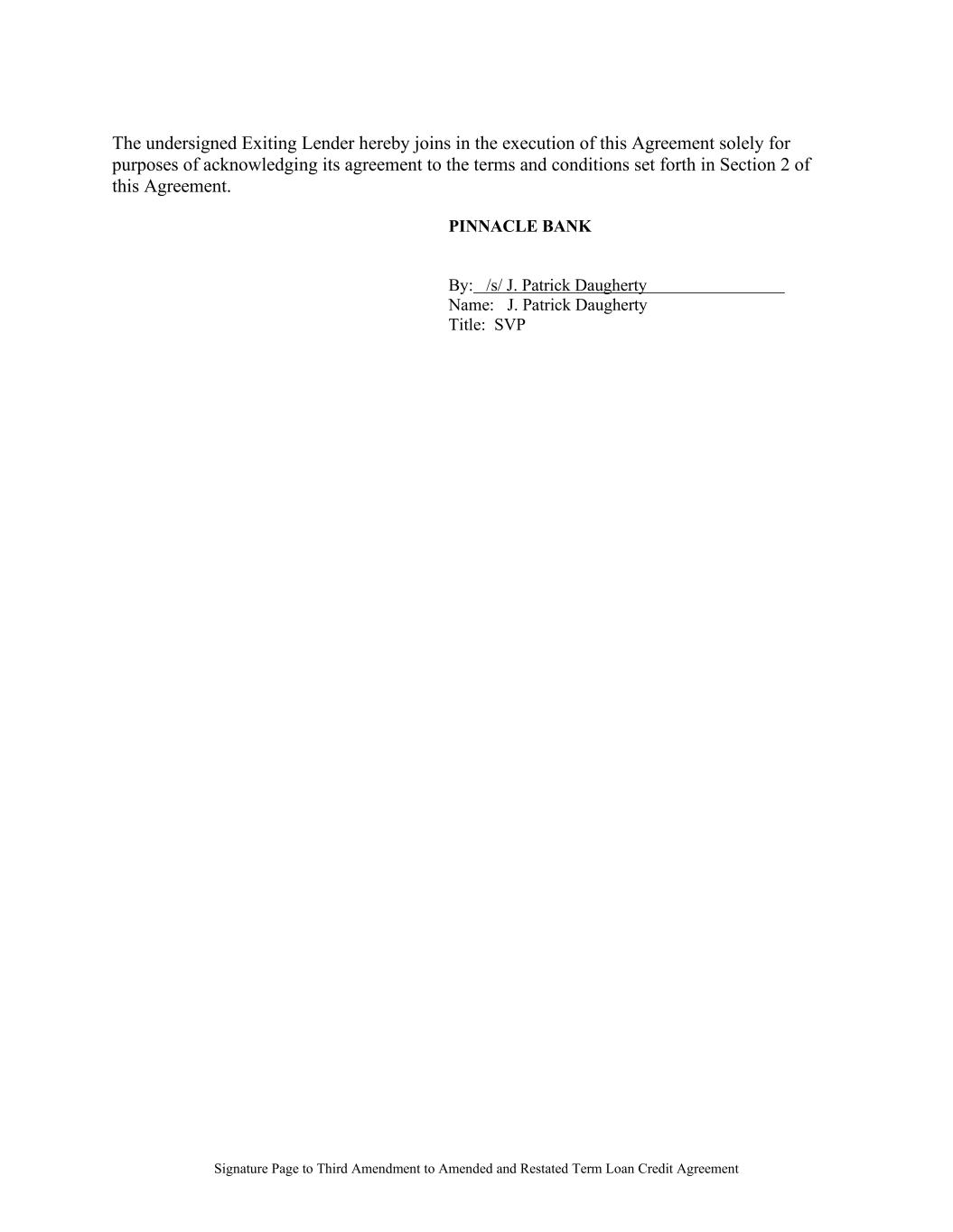 Signature Page to Third Amendment to Amended and Restated Term Loan Credit Agreement The undersigned Exiting Lender hereby joins in the execution of this Agreement solely for purposes of acknowledging its agreement to the terms and conditions set forth in Section 2 of this Agreement. PINNACLE BANK By: /s/ J. Patrick Daugherty Name: J. Patrick Daugherty Title: SVP