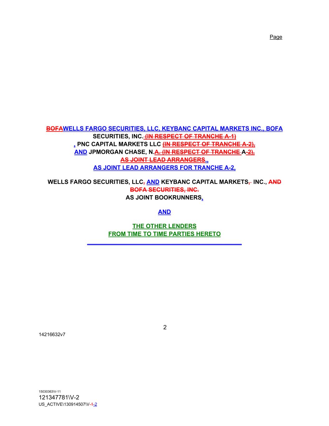 Page 2 14216632v7 15030363\V-11 121347781\V-2 US_ACTIVE\130914507\V-1-2 BOFAWELLS FARGO SECURITIES, LLC, KEYBANC CAPITAL MARKETS INC., BOFA SECURITIES, INC. (IN RESPECT OF TRANCHE A-1) , PNC CAPITAL MARKETS LLC (IN RESPECT OF TRANCHE A-2), AND JPMORGAN CHASE, N.A. (IN RESPECT OF TRANCHE A-2), AS JOINT LEAD ARRANGERS., AS JOINT LEAD ARRANGERS FOR TRANCHE A-2, WELLS FARGO SECURITIES, LLC, AND KEYBANC CAPITAL MARKETS, INC., AND BOFA SECURITIES, INC. AS JOINT BOOKRUNNERS, AND THE OTHER LENDERS FROM TIME TO TIME PARTIES HERETO _______________________________________________