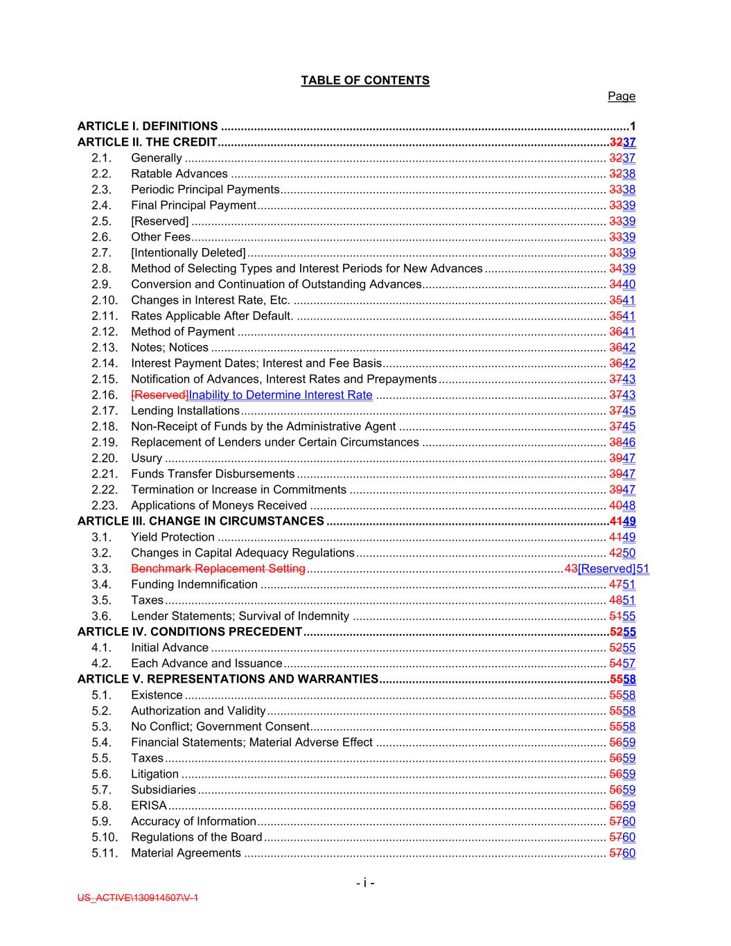 - i - US_ACTIVE\130914507\V-1 TABLE OF CONTENTS Page ARTICLE I. DEFINITIONS ............................................................................................................................ 1 ARTICLE II. THE CREDIT .......................................................................................................................3237 Generally ................................................................................................................................ 3237 Ratable Advances .................................................................................................................. 3238 Periodic Principal Payments ................................................................................................... 3338 Final Principal Payment .......................................................................................................... 3339 [Reserved] .............................................................................................................................. 3339 Other Fees .............................................................................................................................. 3339 [Intentionally Deleted] ............................................................................................................. 3339 Method of Selecting Types and Interest Periods for New Advances ..................................... 3439 Conversion and Continuation of Outstanding Advances........................................................ 3440 Changes in Interest Rate, Etc. ............................................................................................... 3541 Rates Applicable After Default. .............................................................................................. 3541 Method of Payment ................................................................................................................ 3641 Notes; Notices ........................................................................................................................ 3642 Interest Payment Dates; Interest and Fee Basis .................................................................... 3642 Notification of Advances, Interest Rates and Prepayments ................................................... 3743 [Reserved]Inability to Determine Interest Rate ...................................................................... 3743 Lending Installations ............................................................................................................... 3745 Non-Receipt of Funds by the Administrative Agent ............................................................... 3745 Replacement of Lenders under Certain Circumstances ........................................................ 3846 Usury ...................................................................................................................................... 3947 Funds Transfer Disbursements .............................................................................................. 3947 Termination or Increase in Commitments .............................................................................. 3947 Applications of Moneys Received .......................................................................................... 4048 ARTICLE III. CHANGE IN CIRCUMSTANCES ......................................................................................4149 Yield Protection ...................................................................................................................... 4149 Changes in Capital Adequacy Regulations ............................................................................ 4250 Benchmark Replacement Setting .............................................................................. 43[Reserved] 51 Funding Indemnification ......................................................................................................... 4751 Taxes ...................................................................................................................................... 4851 Lender Statements; Survival of Indemnity ............................................................................. 5155 ARTICLE IV. CONDITIONS PRECEDENT .............................................................................................5255 Initial Advance ........................................................................................................................ 5255 Each Advance and Issuance .................................................................................................. 5457 ARTICLE V. REPRESENTATIONS AND WARRANTIES ......................................................................5558 Existence ................................................................................................................................ 5558 Authorization and Validity ....................................................................................................... 5558 No Conflict; Government Consent .......................................................................................... 5558 Financial Statements; Material Adverse Effect ...................................................................... 5659 Taxes ...................................................................................................................................... 5659 Litigation ................................................................................................................................. 5659 Subsidiaries ............................................................................................................................ 5659 ERISA ..................................................................................................................................... 5659 Accuracy of Information .....................................................................................