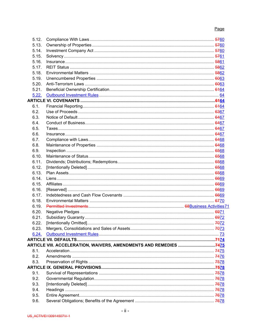 Page - ii - US_ACTIVE\130914507\V-1 Compliance With Laws ........................................................................................................... 5760 Ownership of Properties ......................................................................................................... 5760 Investment Company Act ....................................................................................................... 5760 Solvency ................................................................................................................................. 5761 Insurance ................................................................................................................................ 5861 REIT Status ............................................................................................................................ 5862 Environmental Matters ........................................................................................................... 5862 Unencumbered Properties ..................................................................................................... 6063 Anti-Terrorism Laws ............................................................................................................... 6063 Beneficial Ownership Certification .......................................................................................... 6164 Outbound Investment Rules ....................................................................................................... 64 ARTICLE VI. COVENANTS ....................................................................................................................6164 Financial Reporting................................................................................................................. 6164 Use of Proceeds ..................................................................................................................... 6367 Notice of Default ..................................................................................................................... 6467 Conduct of Business............................................................................................................... 6467 Taxes ...................................................................................................................................... 6467 Insurance ................................................................................................................................ 6467 Compliance with Laws ............................................................................................................ 6468 Maintenance of Properties ..................................................................................................... 6468 Inspection ............................................................................................................................... 6568 Maintenance of Status ............................................................................................................ 6568 Dividends; Distributions; Redemptions................................................................................... 6568 [Intentionally Deleted] ............................................................................................................. 6568 Plan Assets ............................................................................................................................. 6568 Liens ....................................................................................................................................... 6669 Affiliates .................................................................................................................................. 6669 [Reserved] .............................................................................................................................. 6669 Indebtedness and Cash Flow Covenants .............................................................................. 6669 Environmental Matters ........................................................................................................... 6770 Permitted Investments .................................................................................. 68Business Activities 71 Negative Pledges ................................................................................................................... 6971 Subsidiary Guaranty ............................................................................................................... 6972 [Intentionally Omitted] ............................................................................................................. 7072 Mergers, Consolidations and Sales of Assets ........................................................................ 7073 Outbound Investment Rules ....................................................................................................... 73 ARTICLE VII. DEFAULTS .......................................................................................................................7174 ARTICLE VIII. ACCELERATION, WAIVERS, AMENDMENTS AND REMEDIES ................................7475 Acceleration ............................................................................................................................ 7475 Amendments .......................................................................................................................... 7476 Preservation of Rights ............................................................................................................ 7578 ARTICLE IX. GENERAL PROVISIONS ..................................................................................................7578 Survival of Representations ................................................................................................... 7578 Governmental Regulation .............................................................................