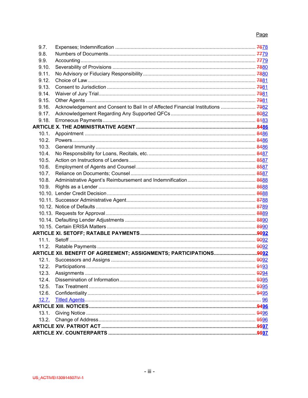 Page - iii - US_ACTIVE\130914507\V-1 Expenses; Indemnification ..................................................................................................... 7678 Numbers of Documents .......................................................................................................... 7779 Accounting .............................................................................................................................. 7779 Severability of Provisions ....................................................................................................... 7880 No Advisory or Fiduciary Responsibility ................................................................................. 7880 Choice of Law ......................................................................................................................... 7881 Consent to Jurisdiction ........................................................................................................... 7981 Waiver of Jury Trial................................................................................................................. 7981 Other Agents .......................................................................................................................... 7981 Acknowledgement and Consent to Bail In of Affected Financial Institutions ......................... 7982 Acknowledgement Regarding Any Supported QFCs ............................................................. 8082 Erroneous Payments .............................................................................................................. 8183 ARTICLE X. THE ADMINISTRATIVE AGENT .......................................................................................8486 Appointment ........................................................................................................................... 8486 Powers .................................................................................................................................... 8486 General Immunity ................................................................................................................... 8486 No Responsibility for Loans, Recitals, etc. ............................................................................. 8487 Action on Instructions of Lenders ........................................................................................... 8587 Employment of Agents and Counsel ...................................................................................... 8587 Reliance on Documents; Counsel .......................................................................................... 8587 Administrative Agent’s Reimbursement and Indemnification ................................................. 8688 Rights as a Lender ................................................................................................................. 8688 Lender Credit Decision ........................................................................................................... 8688 Successor Administrative Agent ............................................................................................. 8788 Notice of Defaults ................................................................................................................... 8789 Requests for Approval ............................................................................................................ 8889 Defaulting Lender Adjustments .............................................................................................. 8890 Certain ERISA Matters ........................................................................................................... 8990 ARTICLE XI. SETOFF; RATABLE PAYMENTS ....................................................................................9092 Setoff ...................................................................................................................................... 9092 Ratable Payments .................................................................................................................. 9092 ARTICLE XII. BENEFIT OF AGREEMENT; ASSIGNMENTS; PARTICIPATIONS ...............................9092 Successors and Assigns ........................................................................................................ 9092 Participations .......................................................................................................................... 9193 Assignments ........................................................................................................................... 9294 Dissemination of Information .................................................................................................. 9395 Tax Treatment ........................................................................................................................ 9395 Confidentiality ......................................................................................................................... 9495 Titled Agents ............................................................................................................................... 96 ARTICLE XIII. NOTICES .........................................................................................................................9496 Giving Notice .......................................................................................................................... 9496 Change of Address ................................................................................................................. 9596 ARTICLE XIV. PATRIOT ACT ................................................................................................................9597 ARTICLE XV. COUNTERPARTS ...........................................................................................................9597