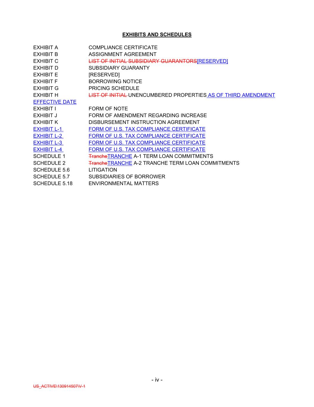 - iv - US_ACTIVE\130914507\V-1 EXHIBITS AND SCHEDULES EXHIBIT A COMPLIANCE CERTIFICATE EXHIBIT B ASSIGNMENT AGREEMENT EXHIBIT C LIST OF INITIAL SUBSIDIARY GUARANTORS[RESERVED] EXHIBIT D SUBSIDIARY GUARANTY EXHIBIT E [RESERVED] EXHIBIT F BORROWING NOTICE EXHIBIT G PRICING SCHEDULE EXHIBIT H LIST OF INITIAL UNENCUMBERED PROPERTIES AS OF THIRD AMENDMENT EFFECTIVE DATE EXHIBIT I FORM OF NOTE EXHIBIT J FORM OF AMENDMENT REGARDING INCREASE EXHIBIT K DISBURSEMENT INSTRUCTION AGREEMENT EXHIBIT L-1 FORM OF U.S. TAX COMPLIANCE CERTIFICATE EXHIBIT L-2 FORM OF U.S. TAX COMPLIANCE CERTIFICATE EXHIBIT L-3 FORM OF U.S. TAX COMPLIANCE CERTIFICATE EXHIBIT L-4 FORM OF U.S. TAX COMPLIANCE CERTIFICATE SCHEDULE 1 TrancheTRANCHE A-1 TERM LOAN COMMITMENTS SCHEDULE 2 TrancheTRANCHE A-2 TRANCHE TERM LOAN COMMITMENTS SCHEDULE 5.6 LITIGATION SCHEDULE 5.7 SUBSIDIARIES OF BORROWER SCHEDULE 5.18 ENVIRONMENTAL MATTERS