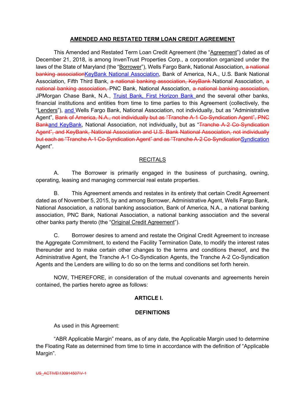 US_ACTIVE\130914507\V-1 AMENDED AND RESTATED TERM LOAN CREDIT AGREEMENT This Amended and Restated Term Loan Credit Agreement (the “Agreement”) dated as of December 21, 2018, is among InvenTrust Properties Corp., a corporation organized under the laws of the State of Maryland (the “Borrower”), Wells Fargo Bank, National Association, a national banking associationKeyBank National Association, Bank of America, N.A., U.S. Bank National Association, Fifth Third Bank, a national banking association, KeyBank National Association, a national banking association, PNC Bank, National Association, a national banking association, JPMorgan Chase Bank, N.A., Truist Bank, First Horizon Bank and the several other banks, financial institutions and entities from time to time parties to this Agreement (collectively, the “Lenders”), and Wells Fargo Bank, National Association, not individually, but as “Administrative Agent”, Bank of America, N.A., not individually but as “Tranche A-1 Co-Syndication Agent”, PNC Bankand KeyBank, National Association, not individually, but as “Tranche A-2 Co-Syndication Agent”, and KeyBank, National Association and U.S. Bank National Association, not individually but each as “Tranche A-1 Co-Syndication Agent” and as “Tranche A-2 Co-SyndicationSyndication Agent”. RECITALS A. The Borrower is primarily engaged in the business of purchasing, owning, operating, leasing and managing commercial real estate properties. B. This Agreement amends and restates in its entirety that certain Credit Agreement dated as of November 5, 2015, by and among Borrower, Administrative Agent, Wells Fargo Bank, National Association, a national banking association, Bank of America, N.A., a national banking association, PNC Bank, National Association, a national banking association and the several other banks party thereto (the “Original Credit Agreement”). C. Borrower desires to amend and restate the Original Credit Agreement to increase the Aggregate Commitment, to extend the Facility Termination Date, to modify the interest rates thereunder and to make certain other changes to the terms and conditions thereof, and the Administrative Agent, the Tranche A-1 Co-Syndication Agents, the Tranche A-2 Co-Syndication Agents and the Lenders are willing to do so on the terms and conditions set forth herein. NOW, THEREFORE, in consideration of the mutual covenants and agreements herein contained, the parties hereto agree as follows: ARTICLE I. DEFINITIONS As used in this Agreement: “ABR Applicable Margin” means, as of any date, the Applicable Margin used to determine the Floating Rate as determined from time to time in accordance with the definition of “Applicable Margin”.
