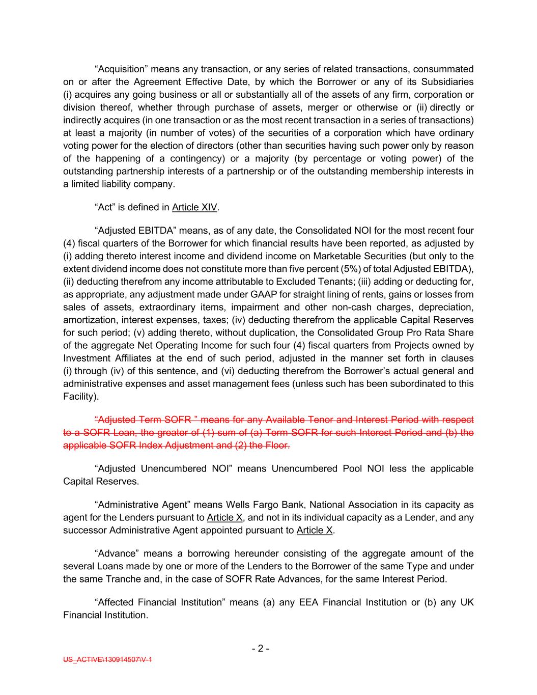 - 2 - US_ACTIVE\130914507\V-1 “Acquisition” means any transaction, or any series of related transactions, consummated on or after the Agreement Effective Date, by which the Borrower or any of its Subsidiaries (i) acquires any going business or all or substantially all of the assets of any firm, corporation or division thereof, whether through purchase of assets, merger or otherwise or (ii) directly or indirectly acquires (in one transaction or as the most recent transaction in a series of transactions) at least a majority (in number of votes) of the securities of a corporation which have ordinary voting power for the election of directors (other than securities having such power only by reason of the happening of a contingency) or a majority (by percentage or voting power) of the outstanding partnership interests of a partnership or of the outstanding membership interests in a limited liability company. “Act” is defined in Article XIV. “Adjusted EBITDA” means, as of any date, the Consolidated NOI for the most recent four (4) fiscal quarters of the Borrower for which financial results have been reported, as adjusted by (i) adding thereto interest income and dividend income on Marketable Securities (but only to the extent dividend income does not constitute more than five percent (5%) of total Adjusted EBITDA), (ii) deducting therefrom any income attributable to Excluded Tenants; (iii) adding or deducting for, as appropriate, any adjustment made under GAAP for straight lining of rents, gains or losses from sales of assets, extraordinary items, impairment and other non-cash charges, depreciation, amortization, interest expenses, taxes; (iv) deducting therefrom the applicable Capital Reserves for such period; (v) adding thereto, without duplication, the Consolidated Group Pro Rata Share of the aggregate Net Operating Income for such four (4) fiscal quarters from Projects owned by Investment Affiliates at the end of such period, adjusted in the manner set forth in clauses (i) through (iv) of this sentence, and (vi) deducting therefrom the Borrower’s actual general and administrative expenses and asset management fees (unless such has been subordinated to this Facility). “Adjusted Term SOFR ” means for any Available Tenor and Interest Period with respect to a SOFR Loan, the greater of (1) sum of (a) Term SOFR for such Interest Period and (b) the applicable SOFR Index Adjustment and (2) the Floor. “Adjusted Unencumbered NOI” means Unencumbered Pool NOI less the applicable Capital Reserves. “Administrative Agent” means Wells Fargo Bank, National Association in its capacity as agent for the Lenders pursuant to Article X, and not in its individual capacity as a Lender, and any successor Administrative Agent appointed pursuant to Article X. “Advance” means a borrowing hereunder consisting of the aggregate amount of the several Loans made by one or more of the Lenders to the Borrower of the same Type and under the same Tranche and, in the case of SOFR Rate Advances, for the same Interest Period. “Affected Financial Institution” means (a) any EEA Financial Institution or (b) any UK Financial Institution.