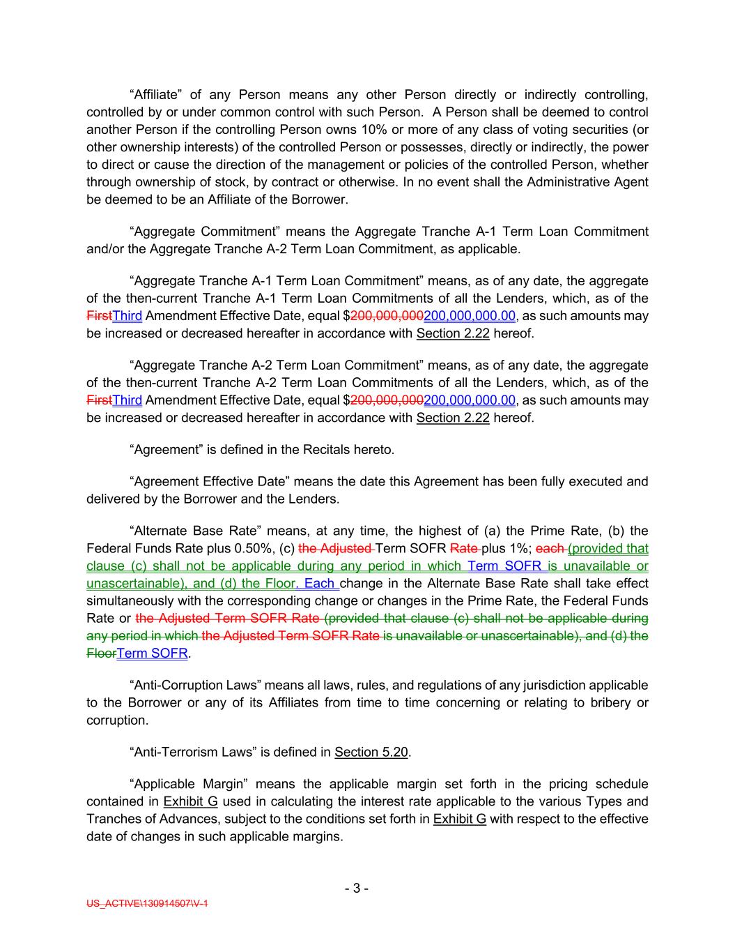 - 3 - US_ACTIVE\130914507\V-1 “Affiliate” of any Person means any other Person directly or indirectly controlling, controlled by or under common control with such Person. A Person shall be deemed to control another Person if the controlling Person owns 10% or more of any class of voting securities (or other ownership interests) of the controlled Person or possesses, directly or indirectly, the power to direct or cause the direction of the management or policies of the controlled Person, whether through ownership of stock, by contract or otherwise. In no event shall the Administrative Agent be deemed to be an Affiliate of the Borrower. “Aggregate Commitment” means the Aggregate Tranche A-1 Term Loan Commitment and/or the Aggregate Tranche A-2 Term Loan Commitment, as applicable. “Aggregate Tranche A-1 Term Loan Commitment” means, as of any date, the aggregate of the then-current Tranche A-1 Term Loan Commitments of all the Lenders, which, as of the FirstThird Amendment Effective Date, equal $200,000,000200,000,000.00, as such amounts may be increased or decreased hereafter in accordance with Section 2.22 hereof. “Aggregate Tranche A-2 Term Loan Commitment” means, as of any date, the aggregate of the then-current Tranche A-2 Term Loan Commitments of all the Lenders, which, as of the FirstThird Amendment Effective Date, equal $200,000,000200,000,000.00, as such amounts may be increased or decreased hereafter in accordance with Section 2.22 hereof. “Agreement” is defined in the Recitals hereto. “Agreement Effective Date” means the date this Agreement has been fully executed and delivered by the Borrower and the Lenders. “Alternate Base Rate” means, at any time, the highest of (a) the Prime Rate, (b) the Federal Funds Rate plus 0.50%, (c) the Adjusted Term SOFR Rate plus 1%; each (provided that clause (c) shall not be applicable during any period in which Term SOFR is unavailable or unascertainable), and (d) the Floor. Each change in the Alternate Base Rate shall take effect simultaneously with the corresponding change or changes in the Prime Rate, the Federal Funds Rate or the Adjusted Term SOFR Rate (provided that clause (c) shall not be applicable during any period in which the Adjusted Term SOFR Rate is unavailable or unascertainable), and (d) the FloorTerm SOFR. “Anti-Corruption Laws” means all laws, rules, and regulations of any jurisdiction applicable to the Borrower or any of its Affiliates from time to time concerning or relating to bribery or corruption. “Anti-Terrorism Laws” is defined in Section 5.20. “Applicable Margin” means the applicable margin set forth in the pricing schedule contained in Exhibit G used in calculating the interest rate applicable to the various Types and Tranches of Advances, subject to the conditions set forth in Exhibit G with respect to the effective date of changes in such applicable margins.