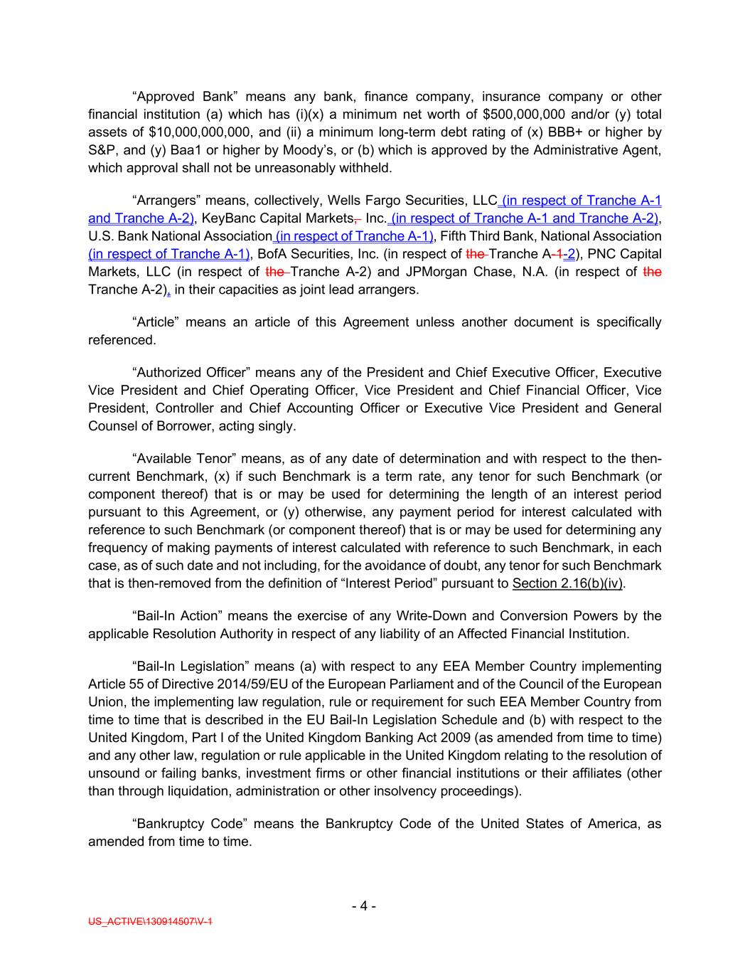 - 4 - US_ACTIVE\130914507\V-1 “Approved Bank” means any bank, finance company, insurance company or other financial institution (a) which has (i)(x) a minimum net worth of $500,000,000 and/or (y) total assets of $10,000,000,000, and (ii) a minimum long-term debt rating of (x) BBB+ or higher by S&P, and (y) Baa1 or higher by Moody’s, or (b) which is approved by the Administrative Agent, which approval shall not be unreasonably withheld. “Arrangers” means, collectively, Wells Fargo Securities, LLC (in respect of Tranche A-1 and Tranche A-2), KeyBanc Capital Markets, Inc. (in respect of Tranche A-1 and Tranche A-2), U.S. Bank National Association (in respect of Tranche A-1), Fifth Third Bank, National Association (in respect of Tranche A-1), BofA Securities, Inc. (in respect of the Tranche A-1-2), PNC Capital Markets, LLC (in respect of the Tranche A-2) and JPMorgan Chase, N.A. (in respect of the Tranche A-2), in their capacities as joint lead arrangers. “Article” means an article of this Agreement unless another document is specifically referenced. “Authorized Officer” means any of the President and Chief Executive Officer, Executive Vice President and Chief Operating Officer, Vice President and Chief Financial Officer, Vice President, Controller and Chief Accounting Officer or Executive Vice President and General Counsel of Borrower, acting singly. “Available Tenor” means, as of any date of determination and with respect to the then- current Benchmark, (x) if such Benchmark is a term rate, any tenor for such Benchmark (or component thereof) that is or may be used for determining the length of an interest period pursuant to this Agreement, or (y) otherwise, any payment period for interest calculated with reference to such Benchmark (or component thereof) that is or may be used for determining any frequency of making payments of interest calculated with reference to such Benchmark, in each case, as of such date and not including, for the avoidance of doubt, any tenor for such Benchmark that is then-removed from the definition of “Interest Period” pursuant to Section 2.16(b)(iv). “Bail-In Action” means the exercise of any Write-Down and Conversion Powers by the applicable Resolution Authority in respect of any liability of an Affected Financial Institution. “Bail-In Legislation” means (a) with respect to any EEA Member Country implementing Article 55 of Directive 2014/59/EU of the European Parliament and of the Council of the European Union, the implementing law regulation, rule or requirement for such EEA Member Country from time to time that is described in the EU Bail-In Legislation Schedule and (b) with respect to the United Kingdom, Part I of the United Kingdom Banking Act 2009 (as amended from time to time) and any other law, regulation or rule applicable in the United Kingdom relating to the resolution of unsound or failing banks, investment firms or other financial institutions or their affiliates (other than through liquidation, administration or other insolvency proceedings). “Bankruptcy Code” means the Bankruptcy Code of the United States of America, as amended from time to time.