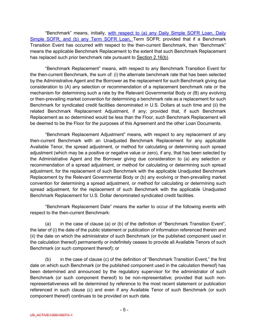 - 5 - US_ACTIVE\130914507\V-1 “Benchmark” means, initially, with respect to (a) any Daily Simple SOFR Loan, Daily Simple SOFR, and (b) any Term SOFR Loan, Term SOFR; provided that if a Benchmark Transition Event has occurred with respect to the then-current Benchmark, then “Benchmark” means the applicable Benchmark Replacement to the extent that such Benchmark Replacement has replaced such prior benchmark rate pursuant to Section 2.16(b). “Benchmark Replacement” means, with respect to any Benchmark Transition Event for the then-current Benchmark, the sum of: (i) the alternate benchmark rate that has been selected by the Administrative Agent and the Borrower as the replacement for such Benchmark giving due consideration to (A) any selection or recommendation of a replacement benchmark rate or the mechanism for determining such a rate by the Relevant Governmental Body or (B) any evolving or then-prevailing market convention for determining a benchmark rate as a replacement for such Benchmark for syndicated credit facilities denominated in U.S. Dollars at such time and (ii) the related Benchmark Replacement Adjustment, if any; provided that, if such Benchmark Replacement as so determined would be less than the Floor, such Benchmark Replacement will be deemed to be the Floor for the purposes of this Agreement and the other Loan Documents. “Benchmark Replacement Adjustment” means, with respect to any replacement of any then-current Benchmark with an Unadjusted Benchmark Replacement for any applicable Available Tenor, the spread adjustment, or method for calculating or determining such spread adjustment (which may be a positive or negative value or zero), if any, that has been selected by the Administrative Agent and the Borrower giving due consideration to (a) any selection or recommendation of a spread adjustment, or method for calculating or determining such spread adjustment, for the replacement of such Benchmark with the applicable Unadjusted Benchmark Replacement by the Relevant Governmental Body or (b) any evolving or then-prevailing market convention for determining a spread adjustment, or method for calculating or determining such spread adjustment, for the replacement of such Benchmark with the applicable Unadjusted Benchmark Replacement for U.S. Dollar denominated syndicated credit facilities. “Benchmark Replacement Date” means the earlier to occur of the following events with respect to the then-current Benchmark: (a) in the case of clause (a) or (b) of the definition of “Benchmark Transition Event”, the later of (i) the date of the public statement or publication of information referenced therein and (ii) the date on which the administrator of such Benchmark (or the published component used in the calculation thereof) permanently or indefinitely ceases to provide all Available Tenors of such Benchmark (or such component thereof); or (b) in the case of clause (c) of the definition of “Benchmark Transition Event,” the first date on which such Benchmark (or the published component used in the calculation thereof) has been determined and announced by the regulatory supervisor for the administrator of such Benchmark (or such component thereof) to be non-representative; provided that such non- representativeness will be determined by reference to the most recent statement or publication referenced in such clause (c) and even if any Available Tenor of such Benchmark (or such component thereof) continues to be provided on such date.