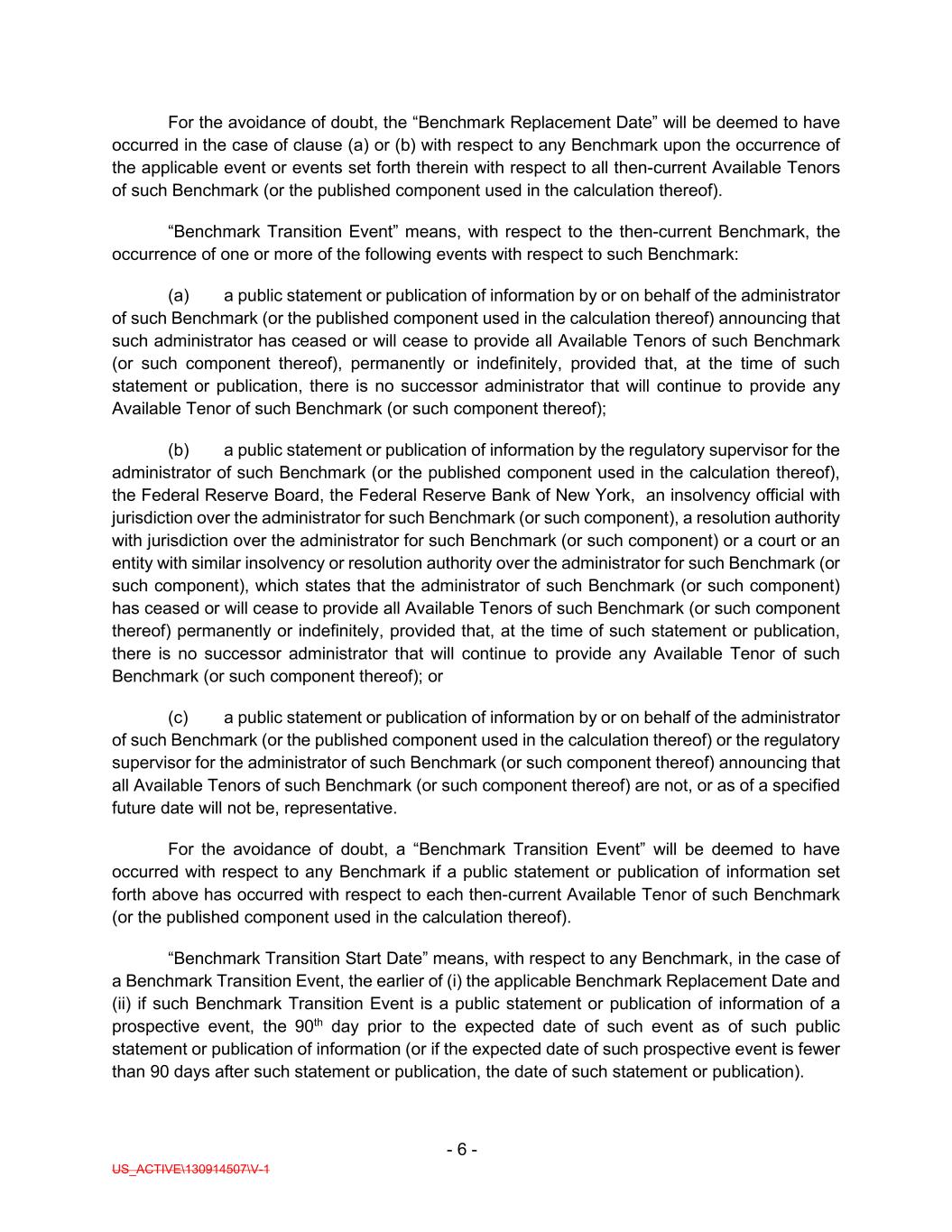 - 6 - US_ACTIVE\130914507\V-1 For the avoidance of doubt, the “Benchmark Replacement Date” will be deemed to have occurred in the case of clause (a) or (b) with respect to any Benchmark upon the occurrence of the applicable event or events set forth therein with respect to all then-current Available Tenors of such Benchmark (or the published component used in the calculation thereof). “Benchmark Transition Event” means, with respect to the then-current Benchmark, the occurrence of one or more of the following events with respect to such Benchmark: (a) a public statement or publication of information by or on behalf of the administrator of such Benchmark (or the published component used in the calculation thereof) announcing that such administrator has ceased or will cease to provide all Available Tenors of such Benchmark (or such component thereof), permanently or indefinitely, provided that, at the time of such statement or publication, there is no successor administrator that will continue to provide any Available Tenor of such Benchmark (or such component thereof); (b) a public statement or publication of information by the regulatory supervisor for the administrator of such Benchmark (or the published component used in the calculation thereof), the Federal Reserve Board, the Federal Reserve Bank of New York, an insolvency official with jurisdiction over the administrator for such Benchmark (or such component), a resolution authority with jurisdiction over the administrator for such Benchmark (or such component) or a court or an entity with similar insolvency or resolution authority over the administrator for such Benchmark (or such component), which states that the administrator of such Benchmark (or such component) has ceased or will cease to provide all Available Tenors of such Benchmark (or such component thereof) permanently or indefinitely, provided that, at the time of such statement or publication, there is no successor administrator that will continue to provide any Available Tenor of such Benchmark (or such component thereof); or (c) a public statement or publication of information by or on behalf of the administrator of such Benchmark (or the published component used in the calculation thereof) or the regulatory supervisor for the administrator of such Benchmark (or such component thereof) announcing that all Available Tenors of such Benchmark (or such component thereof) are not, or as of a specified future date will not be, representative. For the avoidance of doubt, a “Benchmark Transition Event” will be deemed to have occurred with respect to any Benchmark if a public statement or publication of information set forth above has occurred with respect to each then-current Available Tenor of such Benchmark (or the published component used in the calculation thereof). “Benchmark Transition Start Date” means, with respect to any Benchmark, in the case of a Benchmark Transition Event, the earlier of (i) the applicable Benchmark Replacement Date and (ii) if such Benchmark Transition Event is a public statement or publication of information of a prospective event, the 90th day prior to the expected date of such event as of such public statement or publication of information (or if the expected date of such prospective event is fewer than 90 days after such statement or publication, the date of such statement or publication).