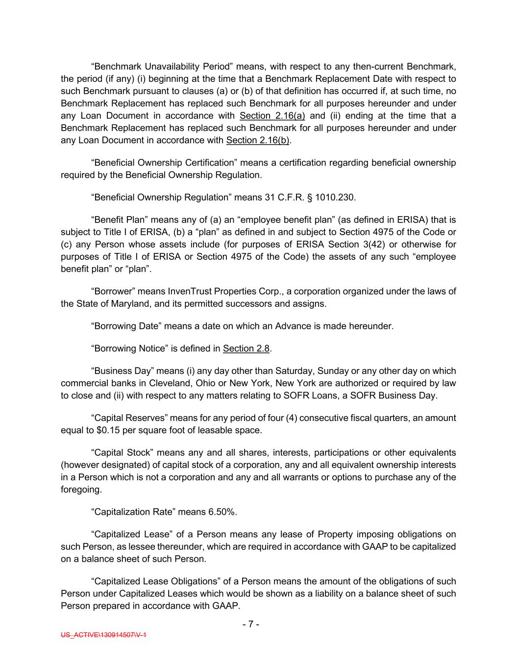 - 7 - US_ACTIVE\130914507\V-1 “Benchmark Unavailability Period” means, with respect to any then-current Benchmark, the period (if any) (i) beginning at the time that a Benchmark Replacement Date with respect to such Benchmark pursuant to clauses (a) or (b) of that definition has occurred if, at such time, no Benchmark Replacement has replaced such Benchmark for all purposes hereunder and under any Loan Document in accordance with Section 2.16(a) and (ii) ending at the time that a Benchmark Replacement has replaced such Benchmark for all purposes hereunder and under any Loan Document in accordance with Section 2.16(b). “Beneficial Ownership Certification” means a certification regarding beneficial ownership required by the Beneficial Ownership Regulation. “Beneficial Ownership Regulation” means 31 C.F.R. § 1010.230. “Benefit Plan” means any of (a) an “employee benefit plan” (as defined in ERISA) that is subject to Title I of ERISA, (b) a “plan” as defined in and subject to Section 4975 of the Code or (c) any Person whose assets include (for purposes of ERISA Section 3(42) or otherwise for purposes of Title I of ERISA or Section 4975 of the Code) the assets of any such “employee benefit plan” or “plan”. “Borrower” means InvenTrust Properties Corp., a corporation organized under the laws of the State of Maryland, and its permitted successors and assigns. “Borrowing Date” means a date on which an Advance is made hereunder. “Borrowing Notice” is defined in Section 2.8. “Business Day” means (i) any day other than Saturday, Sunday or any other day on which commercial banks in Cleveland, Ohio or New York, New York are authorized or required by law to close and (ii) with respect to any matters relating to SOFR Loans, a SOFR Business Day. “Capital Reserves” means for any period of four (4) consecutive fiscal quarters, an amount equal to $0.15 per square foot of leasable space. “Capital Stock” means any and all shares, interests, participations or other equivalents (however designated) of capital stock of a corporation, any and all equivalent ownership interests in a Person which is not a corporation and any and all warrants or options to purchase any of the foregoing. “Capitalization Rate” means 6.50%. “Capitalized Lease” of a Person means any lease of Property imposing obligations on such Person, as lessee thereunder, which are required in accordance with GAAP to be capitalized on a balance sheet of such Person. “Capitalized Lease Obligations” of a Person means the amount of the obligations of such Person under Capitalized Leases which would be shown as a liability on a balance sheet of such Person prepared in accordance with GAAP.