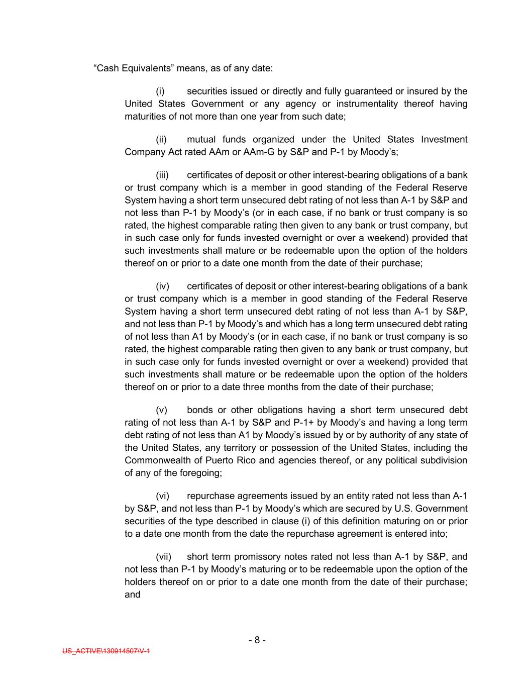 - 8 - US_ACTIVE\130914507\V-1 “Cash Equivalents” means, as of any date: (i) securities issued or directly and fully guaranteed or insured by the United States Government or any agency or instrumentality thereof having maturities of not more than one year from such date; (ii) mutual funds organized under the United States Investment Company Act rated AAm or AAm-G by S&P and P-1 by Moody’s; (iii) certificates of deposit or other interest-bearing obligations of a bank or trust company which is a member in good standing of the Federal Reserve System having a short term unsecured debt rating of not less than A-1 by S&P and not less than P-1 by Moody’s (or in each case, if no bank or trust company is so rated, the highest comparable rating then given to any bank or trust company, but in such case only for funds invested overnight or over a weekend) provided that such investments shall mature or be redeemable upon the option of the holders thereof on or prior to a date one month from the date of their purchase; (iv) certificates of deposit or other interest-bearing obligations of a bank or trust company which is a member in good standing of the Federal Reserve System having a short term unsecured debt rating of not less than A-1 by S&P, and not less than P-1 by Moody’s and which has a long term unsecured debt rating of not less than A1 by Moody’s (or in each case, if no bank or trust company is so rated, the highest comparable rating then given to any bank or trust company, but in such case only for funds invested overnight or over a weekend) provided that such investments shall mature or be redeemable upon the option of the holders thereof on or prior to a date three months from the date of their purchase; (v) bonds or other obligations having a short term unsecured debt rating of not less than A-1 by S&P and P-1+ by Moody’s and having a long term debt rating of not less than A1 by Moody’s issued by or by authority of any state of the United States, any territory or possession of the United States, including the Commonwealth of Puerto Rico and agencies thereof, or any political subdivision of any of the foregoing; (vi) repurchase agreements issued by an entity rated not less than A-1 by S&P, and not less than P-1 by Moody’s which are secured by U.S. Government securities of the type described in clause (i) of this definition maturing on or prior to a date one month from the date the repurchase agreement is entered into; (vii) short term promissory notes rated not less than A-1 by S&P, and not less than P-1 by Moody’s maturing or to be redeemable upon the option of the holders thereof on or prior to a date one month from the date of their purchase; and