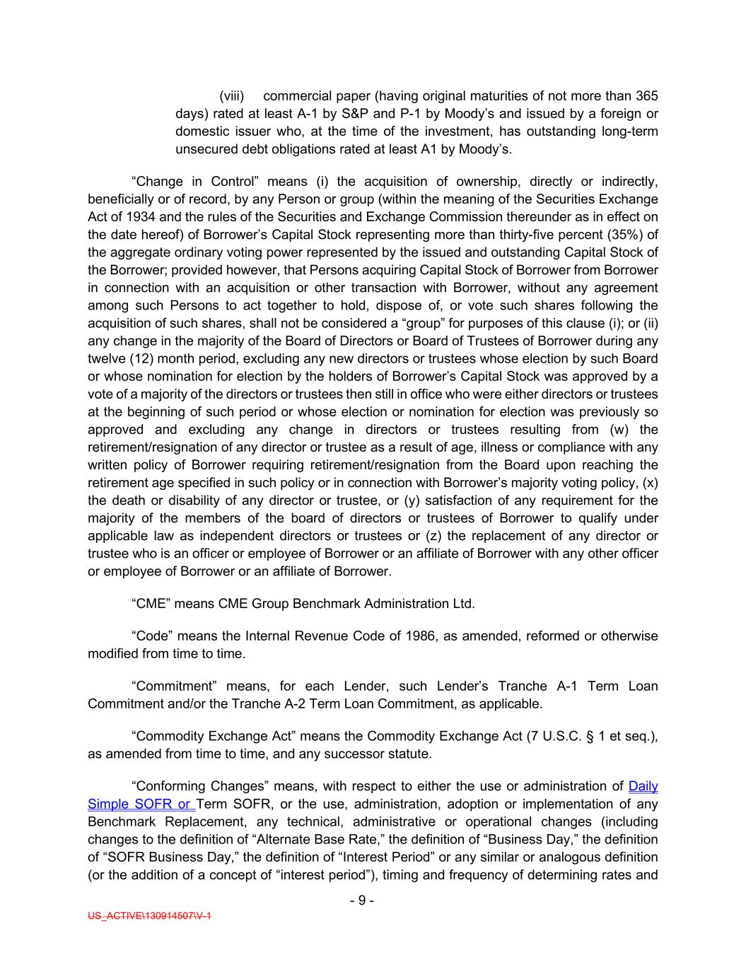 - 9 - US_ACTIVE\130914507\V-1 (viii) commercial paper (having original maturities of not more than 365 days) rated at least A-1 by S&P and P-1 by Moody’s and issued by a foreign or domestic issuer who, at the time of the investment, has outstanding long-term unsecured debt obligations rated at least A1 by Moody’s. “Change in Control” means (i) the acquisition of ownership, directly or indirectly, beneficially or of record, by any Person or group (within the meaning of the Securities Exchange Act of 1934 and the rules of the Securities and Exchange Commission thereunder as in effect on the date hereof) of Borrower’s Capital Stock representing more than thirty-five percent (35%) of the aggregate ordinary voting power represented by the issued and outstanding Capital Stock of the Borrower; provided however, that Persons acquiring Capital Stock of Borrower from Borrower in connection with an acquisition or other transaction with Borrower, without any agreement among such Persons to act together to hold, dispose of, or vote such shares following the acquisition of such shares, shall not be considered a “group” for purposes of this clause (i); or (ii) any change in the majority of the Board of Directors or Board of Trustees of Borrower during any twelve (12) month period, excluding any new directors or trustees whose election by such Board or whose nomination for election by the holders of Borrower’s Capital Stock was approved by a vote of a majority of the directors or trustees then still in office who were either directors or trustees at the beginning of such period or whose election or nomination for election was previously so approved and excluding any change in directors or trustees resulting from (w) the retirement/resignation of any director or trustee as a result of age, illness or compliance with any written policy of Borrower requiring retirement/resignation from the Board upon reaching the retirement age specified in such policy or in connection with Borrower’s majority voting policy, (x) the death or disability of any director or trustee, or (y) satisfaction of any requirement for the majority of the members of the board of directors or trustees of Borrower to qualify under applicable law as independent directors or trustees or (z) the replacement of any director or trustee who is an officer or employee of Borrower or an affiliate of Borrower with any other officer or employee of Borrower or an affiliate of Borrower. “CME” means CME Group Benchmark Administration Ltd. “Code” means the Internal Revenue Code of 1986, as amended, reformed or otherwise modified from time to time. “Commitment” means, for each Lender, such Lender’s Tranche A-1 Term Loan Commitment and/or the Tranche A-2 Term Loan Commitment, as applicable. “Commodity Exchange Act” means the Commodity Exchange Act (7 U.S.C. § 1 et seq.), as amended from time to time, and any successor statute. “Conforming Changes” means, with respect to either the use or administration of Daily Simple SOFR or Term SOFR, or the use, administration, adoption or implementation of any Benchmark Replacement, any technical, administrative or operational changes (including changes to the definition of “Alternate Base Rate,” the definition of “Business Day,” the definition of “SOFR Business Day,” the definition of “Interest Period” or any similar or analogous definition (or the addition of a concept of “interest period”), timing and frequency of determining rates and
