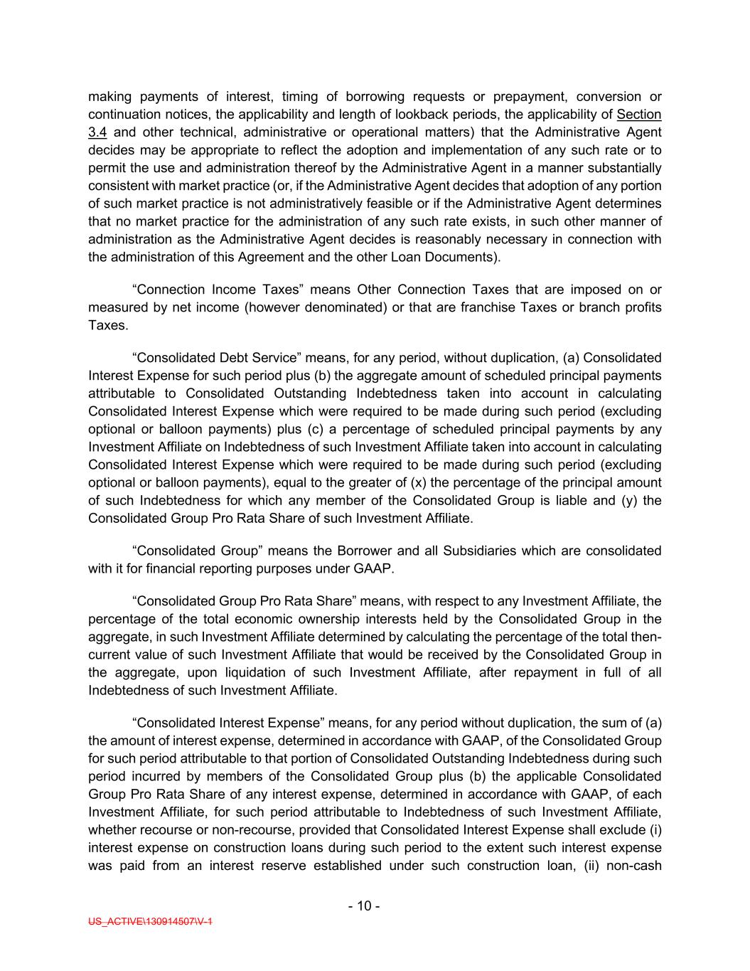 - 10 - US_ACTIVE\130914507\V-1 making payments of interest, timing of borrowing requests or prepayment, conversion or continuation notices, the applicability and length of lookback periods, the applicability of Section 3.4 and other technical, administrative or operational matters) that the Administrative Agent decides may be appropriate to reflect the adoption and implementation of any such rate or to permit the use and administration thereof by the Administrative Agent in a manner substantially consistent with market practice (or, if the Administrative Agent decides that adoption of any portion of such market practice is not administratively feasible or if the Administrative Agent determines that no market practice for the administration of any such rate exists, in such other manner of administration as the Administrative Agent decides is reasonably necessary in connection with the administration of this Agreement and the other Loan Documents). “Connection Income Taxes” means Other Connection Taxes that are imposed on or measured by net income (however denominated) or that are franchise Taxes or branch profits Taxes. “Consolidated Debt Service” means, for any period, without duplication, (a) Consolidated Interest Expense for such period plus (b) the aggregate amount of scheduled principal payments attributable to Consolidated Outstanding Indebtedness taken into account in calculating Consolidated Interest Expense which were required to be made during such period (excluding optional or balloon payments) plus (c) a percentage of scheduled principal payments by any Investment Affiliate on Indebtedness of such Investment Affiliate taken into account in calculating Consolidated Interest Expense which were required to be made during such period (excluding optional or balloon payments), equal to the greater of (x) the percentage of the principal amount of such Indebtedness for which any member of the Consolidated Group is liable and (y) the Consolidated Group Pro Rata Share of such Investment Affiliate. “Consolidated Group” means the Borrower and all Subsidiaries which are consolidated with it for financial reporting purposes under GAAP. “Consolidated Group Pro Rata Share” means, with respect to any Investment Affiliate, the percentage of the total economic ownership interests held by the Consolidated Group in the aggregate, in such Investment Affiliate determined by calculating the percentage of the total then- current value of such Investment Affiliate that would be received by the Consolidated Group in the aggregate, upon liquidation of such Investment Affiliate, after repayment in full of all Indebtedness of such Investment Affiliate. “Consolidated Interest Expense” means, for any period without duplication, the sum of (a) the amount of interest expense, determined in accordance with GAAP, of the Consolidated Group for such period attributable to that portion of Consolidated Outstanding Indebtedness during such period incurred by members of the Consolidated Group plus (b) the applicable Consolidated Group Pro Rata Share of any interest expense, determined in accordance with GAAP, of each Investment Affiliate, for such period attributable to Indebtedness of such Investment Affiliate, whether recourse or non-recourse, provided that Consolidated Interest Expense shall exclude (i) interest expense on construction loans during such period to the extent such interest expense was paid from an interest reserve established under such construction loan, (ii) non-cash