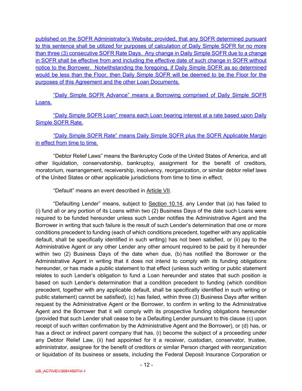 - 12 - US_ACTIVE\130914507\V-1 published on the SOFR Administrator’s Website; provided, that any SOFR determined pursuant to this sentence shall be utilized for purposes of calculation of Daily Simple SOFR for no more than three (3) consecutive SOFR Rate Days. Any change in Daily Simple SOFR due to a change in SOFR shall be effective from and including the effective date of such change in SOFR without notice to the Borrower. Notwithstanding the foregoing, if Daily Simple SOFR as so determined would be less than the Floor, then Daily Simple SOFR will be deemed to be the Floor for the purposes of this Agreement and the other Loan Documents. “Daily Simple SOFR Advance” means a Borrowing comprised of Daily Simple SOFR Loans. “Daily Simple SOFR Loan” means each Loan bearing interest at a rate based upon Daily Simple SOFR Rate. “Daily Simple SOFR Rate” means Daily Simple SOFR plus the SOFR Applicable Margin in effect from time to time. “Debtor Relief Laws” means the Bankruptcy Code of the United States of America, and all other liquidation, conservatorship, bankruptcy, assignment for the benefit of creditors, moratorium, rearrangement, receivership, insolvency, reorganization, or similar debtor relief laws of the United States or other applicable jurisdictions from time to time in effect. “Default” means an event described in Article VII. “Defaulting Lender” means, subject to Section 10.14, any Lender that (a) has failed to (i) fund all or any portion of its Loans within two (2) Business Days of the date such Loans were required to be funded hereunder unless such Lender notifies the Administrative Agent and the Borrower in writing that such failure is the result of such Lender’s determination that one or more conditions precedent to funding (each of which conditions precedent, together with any applicable default, shall be specifically identified in such writing) has not been satisfied, or (ii) pay to the Administrative Agent or any other Lender any other amount required to be paid by it hereunder within two (2) Business Days of the date when due, (b) has notified the Borrower or the Administrative Agent in writing that it does not intend to comply with its funding obligations hereunder, or has made a public statement to that effect (unless such writing or public statement relates to such Lender’s obligation to fund a Loan hereunder and states that such position is based on such Lender‘s determination that a condition precedent to funding (which condition precedent, together with any applicable default, shall be specifically identified in such writing or public statement) cannot be satisfied), (c) has failed, within three (3) Business Days after written request by the Administrative Agent or the Borrower, to confirm in writing to the Administrative Agent and the Borrower that it will comply with its prospective funding obligations hereunder (provided that such Lender shall cease to be a Defaulting Lender pursuant to this clause (c) upon receipt of such written confirmation by the Administrative Agent and the Borrower), or (d) has, or has a direct or indirect parent company that has, (i) become the subject of a proceeding under any Debtor Relief Law, (ii) had appointed for it a receiver, custodian, conservator, trustee, administrator, assignee for the benefit of creditors or similar Person charged with reorganization or liquidation of its business or assets, including the Federal Deposit Insurance Corporation or