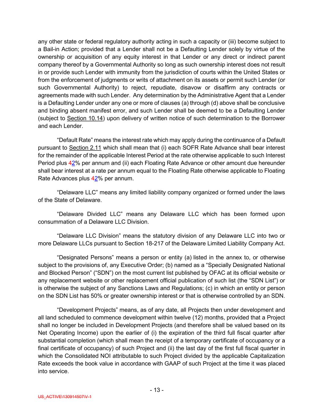 - 13 - US_ACTIVE\130914507\V-1 any other state or federal regulatory authority acting in such a capacity or (iii) become subject to a Bail-in Action; provided that a Lender shall not be a Defaulting Lender solely by virtue of the ownership or acquisition of any equity interest in that Lender or any direct or indirect parent company thereof by a Governmental Authority so long as such ownership interest does not result in or provide such Lender with immunity from the jurisdiction of courts within the United States or from the enforcement of judgments or writs of attachment on its assets or permit such Lender (or such Governmental Authority) to reject, repudiate, disavow or disaffirm any contracts or agreements made with such Lender. Any determination by the Administrative Agent that a Lender is a Defaulting Lender under any one or more of clauses (a) through (d) above shall be conclusive and binding absent manifest error, and such Lender shall be deemed to be a Defaulting Lender (subject to Section 10.14) upon delivery of written notice of such determination to the Borrower and each Lender. “Default Rate” means the interest rate which may apply during the continuance of a Default pursuant to Section 2.11 which shall mean that (i) each SOFR Rate Advance shall bear interest for the remainder of the applicable Interest Period at the rate otherwise applicable to such Interest Period plus 42% per annum and (ii) each Floating Rate Advance or other amount due hereunder shall bear interest at a rate per annum equal to the Floating Rate otherwise applicable to Floating Rate Advances plus 42% per annum. “Delaware LLC” means any limited liability company organized or formed under the laws of the State of Delaware. “Delaware Divided LLC” means any Delaware LLC which has been formed upon consummation of a Delaware LLC Division. “Delaware LLC Division” means the statutory division of any Delaware LLC into two or more Delaware LLCs pursuant to Section 18-217 of the Delaware Limited Liability Company Act. “Designated Persons” means a person or entity (a) listed in the annex to, or otherwise subject to the provisions of, any Executive Order; (b) named as a “Specially Designated National and Blocked Person” (“SDN”) on the most current list published by OFAC at its official website or any replacement website or other replacement official publication of such list (the “SDN List”) or is otherwise the subject of any Sanctions Laws and Regulations; (c) in which an entity or person on the SDN List has 50% or greater ownership interest or that is otherwise controlled by an SDN. “Development Projects” means, as of any date, all Projects then under development and all land scheduled to commence development within twelve (12) months, provided that a Project shall no longer be included in Development Projects (and therefore shall be valued based on its Net Operating Income) upon the earlier of (i) the expiration of the third full fiscal quarter after substantial completion (which shall mean the receipt of a temporary certificate of occupancy or a final certificate of occupancy) of such Project and (ii) the last day of the first full fiscal quarter in which the Consolidated NOI attributable to such Project divided by the applicable Capitalization Rate exceeds the book value in accordance with GAAP of such Project at the time it was placed into service.