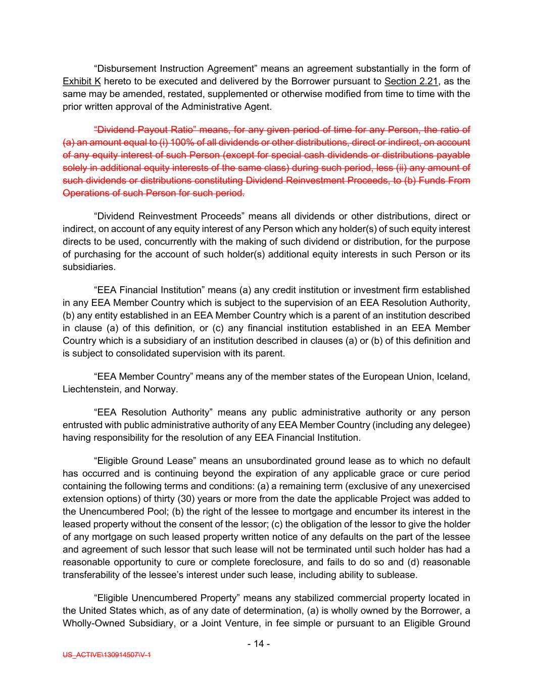 - 14 - US_ACTIVE\130914507\V-1 “Disbursement Instruction Agreement” means an agreement substantially in the form of Exhibit K hereto to be executed and delivered by the Borrower pursuant to Section 2.21, as the same may be amended, restated, supplemented or otherwise modified from time to time with the prior written approval of the Administrative Agent. “Dividend Payout Ratio” means, for any given period of time for any Person, the ratio of (a) an amount equal to (i) 100% of all dividends or other distributions, direct or indirect, on account of any equity interest of such Person (except for special cash dividends or distributions payable solely in additional equity interests of the same class) during such period, less (ii) any amount of such dividends or distributions constituting Dividend Reinvestment Proceeds, to (b) Funds From Operations of such Person for such period. “Dividend Reinvestment Proceeds” means all dividends or other distributions, direct or indirect, on account of any equity interest of any Person which any holder(s) of such equity interest directs to be used, concurrently with the making of such dividend or distribution, for the purpose of purchasing for the account of such holder(s) additional equity interests in such Person or its subsidiaries. “EEA Financial Institution” means (a) any credit institution or investment firm established in any EEA Member Country which is subject to the supervision of an EEA Resolution Authority, (b) any entity established in an EEA Member Country which is a parent of an institution described in clause (a) of this definition, or (c) any financial institution established in an EEA Member Country which is a subsidiary of an institution described in clauses (a) or (b) of this definition and is subject to consolidated supervision with its parent. “EEA Member Country” means any of the member states of the European Union, Iceland, Liechtenstein, and Norway. “EEA Resolution Authority” means any public administrative authority or any person entrusted with public administrative authority of any EEA Member Country (including any delegee) having responsibility for the resolution of any EEA Financial Institution. “Eligible Ground Lease” means an unsubordinated ground lease as to which no default has occurred and is continuing beyond the expiration of any applicable grace or cure period containing the following terms and conditions: (a) a remaining term (exclusive of any unexercised extension options) of thirty (30) years or more from the date the applicable Project was added to the Unencumbered Pool; (b) the right of the lessee to mortgage and encumber its interest in the leased property without the consent of the lessor; (c) the obligation of the lessor to give the holder of any mortgage on such leased property written notice of any defaults on the part of the lessee and agreement of such lessor that such lease will not be terminated until such holder has had a reasonable opportunity to cure or complete foreclosure, and fails to do so and (d) reasonable transferability of the lessee’s interest under such lease, including ability to sublease. “Eligible Unencumbered Property” means any stabilized commercial property located in the United States which, as of any date of determination, (a) is wholly owned by the Borrower, a Wholly-Owned Subsidiary, or a Joint Venture, in fee simple or pursuant to an Eligible Ground