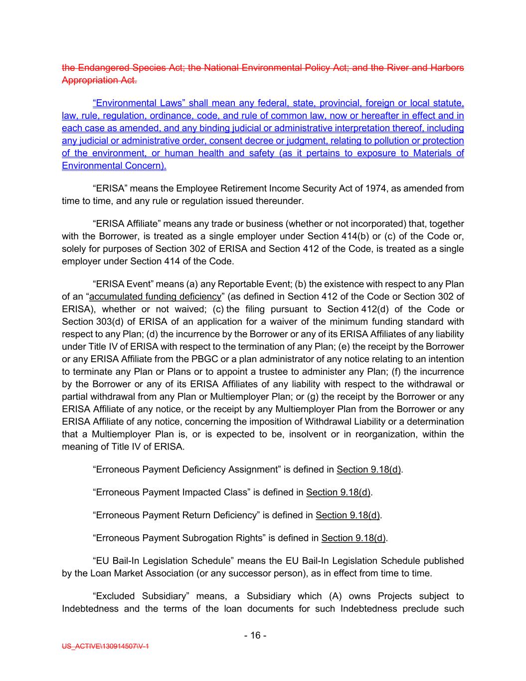 - 16 - US_ACTIVE\130914507\V-1 the Endangered Species Act; the National Environmental Policy Act; and the River and Harbors Appropriation Act. “Environmental Laws” shall mean any federal, state, provincial, foreign or local statute, law, rule, regulation, ordinance, code, and rule of common law, now or hereafter in effect and in each case as amended, and any binding judicial or administrative interpretation thereof, including any judicial or administrative order, consent decree or judgment, relating to pollution or protection of the environment, or human health and safety (as it pertains to exposure to Materials of Environmental Concern). “ERISA” means the Employee Retirement Income Security Act of 1974, as amended from time to time, and any rule or regulation issued thereunder. “ERISA Affiliate” means any trade or business (whether or not incorporated) that, together with the Borrower, is treated as a single employer under Section 414(b) or (c) of the Code or, solely for purposes of Section 302 of ERISA and Section 412 of the Code, is treated as a single employer under Section 414 of the Code. “ERISA Event” means (a) any Reportable Event; (b) the existence with respect to any Plan of an “accumulated funding deficiency” (as defined in Section 412 of the Code or Section 302 of ERISA), whether or not waived; (c) the filing pursuant to Section 412(d) of the Code or Section 303(d) of ERISA of an application for a waiver of the minimum funding standard with respect to any Plan; (d) the incurrence by the Borrower or any of its ERISA Affiliates of any liability under Title IV of ERISA with respect to the termination of any Plan; (e) the receipt by the Borrower or any ERISA Affiliate from the PBGC or a plan administrator of any notice relating to an intention to terminate any Plan or Plans or to appoint a trustee to administer any Plan; (f) the incurrence by the Borrower or any of its ERISA Affiliates of any liability with respect to the withdrawal or partial withdrawal from any Plan or Multiemployer Plan; or (g) the receipt by the Borrower or any ERISA Affiliate of any notice, or the receipt by any Multiemployer Plan from the Borrower or any ERISA Affiliate of any notice, concerning the imposition of Withdrawal Liability or a determination that a Multiemployer Plan is, or is expected to be, insolvent or in reorganization, within the meaning of Title IV of ERISA. “Erroneous Payment Deficiency Assignment” is defined in Section 9.18(d). “Erroneous Payment Impacted Class” is defined in Section 9.18(d). “Erroneous Payment Return Deficiency” is defined in Section 9.18(d). “Erroneous Payment Subrogation Rights” is defined in Section 9.18(d). “EU Bail-In Legislation Schedule” means the EU Bail-In Legislation Schedule published by the Loan Market Association (or any successor person), as in effect from time to time. “Excluded Subsidiary” means, a Subsidiary which (A) owns Projects subject to Indebtedness and the terms of the loan documents for such Indebtedness preclude such