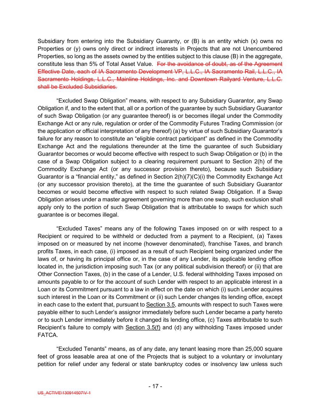 - 17 - US_ACTIVE\130914507\V-1 Subsidiary from entering into the Subsidiary Guaranty, or (B) is an entity which (x) owns no Properties or (y) owns only direct or indirect interests in Projects that are not Unencumbered Properties, so long as the assets owned by the entities subject to this clause (B) in the aggregate, constitute less than 5% of Total Asset Value. For the avoidance of doubt, as of the Agreement Effective Date, each of IA Sacramento Development VP, L.L.C., IA Sacramento Rail, L.L.C., IA Sacramento Holdings, L.L.C., Mainline Holdings, Inc. and Downtown Railyard Venture, L.L.C. shall be Excluded Subsidiaries. “Excluded Swap Obligation” means, with respect to any Subsidiary Guarantor, any Swap Obligation if, and to the extent that, all or a portion of the guarantee by such Subsidiary Guarantor of such Swap Obligation (or any guarantee thereof) is or becomes illegal under the Commodity Exchange Act or any rule, regulation or order of the Commodity Futures Trading Commission (or the application or official interpretation of any thereof) (a) by virtue of such Subsidiary Guarantor’s failure for any reason to constitute an “eligible contract participant” as defined in the Commodity Exchange Act and the regulations thereunder at the time the guarantee of such Subsidiary Guarantor becomes or would become effective with respect to such Swap Obligation or (b) in the case of a Swap Obligation subject to a clearing requirement pursuant to Section 2(h) of the Commodity Exchange Act (or any successor provision thereto), because such Subsidiary Guarantor is a “financial entity,” as defined in Section 2(h)(7)(C)(i) the Commodity Exchange Act (or any successor provision thereto), at the time the guarantee of such Subsidiary Guarantor becomes or would become effective with respect to such related Swap Obligation. If a Swap Obligation arises under a master agreement governing more than one swap, such exclusion shall apply only to the portion of such Swap Obligation that is attributable to swaps for which such guarantee is or becomes illegal. “Excluded Taxes” means any of the following Taxes imposed on or with respect to a Recipient or required to be withheld or deducted from a payment to a Recipient, (a) Taxes imposed on or measured by net income (however denominated), franchise Taxes, and branch profits Taxes, in each case, (i) imposed as a result of such Recipient being organized under the laws of, or having its principal office or, in the case of any Lender, its applicable lending office located in, the jurisdiction imposing such Tax (or any political subdivision thereof) or (ii) that are Other Connection Taxes, (b) in the case of a Lender, U.S. federal withholding Taxes imposed on amounts payable to or for the account of such Lender with respect to an applicable interest in a Loan or its Commitment pursuant to a law in effect on the date on which (i) such Lender acquires such interest in the Loan or its Commitment or (ii) such Lender changes its lending office, except in each case to the extent that, pursuant to Section 3.5, amounts with respect to such Taxes were payable either to such Lender’s assignor immediately before such Lender became a party hereto or to such Lender immediately before it changed its lending office, (c) Taxes attributable to such Recipient’s failure to comply with Section 3.5(f) and (d) any withholding Taxes imposed under FATCA. “Excluded Tenants” means, as of any date, any tenant leasing more than 25,000 square feet of gross leasable area at one of the Projects that is subject to a voluntary or involuntary petition for relief under any federal or state bankruptcy codes or insolvency law unless such