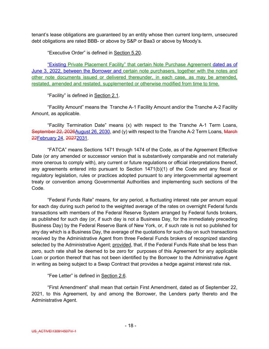 - 18 - US_ACTIVE\130914507\V-1 tenant’s lease obligations are guaranteed by an entity whose then current long-term, unsecured debt obligations are rated BBB- or above by S&P or Baa3 or above by Moody’s. “Executive Order” is defined in Section 5.20. “Existing Private Placement Facility” that certain Note Purchase Agreement dated as of June 3, 2022, between the Borrower and certain note purchasers, together with the notes and other note documents issued or delivered thereunder, in each case, as may be amended, restated, amended and restated, supplemented or otherwise modified from time to time. “Facility” is defined in Section 2.1. “Facility Amount” means the Tranche A-1 Facility Amount and/or the Tranche A-2 Facility Amount, as applicable. “Facility Termination Date” means (x) with respect to the Tranche A-1 Term Loans, September 22, 2026August 26, 2030, and (y) with respect to the Tranche A-2 Term Loans, March 22February 24, 20272031. “FATCA” means Sections 1471 through 1474 of the Code, as of the Agreement Effective Date (or any amended or successor version that is substantively comparable and not materially more onerous to comply with), any current or future regulations or official interpretations thereof, any agreements entered into pursuant to Section 1471(b)(1) of the Code and any fiscal or regulatory legislation, rules or practices adopted pursuant to any intergovernmental agreement treaty or convention among Governmental Authorities and implementing such sections of the Code. “Federal Funds Rate” means, for any period, a fluctuating interest rate per annum equal for each day during such period to the weighted average of the rates on overnight Federal funds transactions with members of the Federal Reserve System arranged by Federal funds brokers, as published for such day (or, if such day is not a Business Day, for the immediately preceding Business Day) by the Federal Reserve Bank of New York, or, if such rate is not so published for any day which is a Business Day, the average of the quotations for such day on such transactions received by the Administrative Agent from three Federal Funds brokers of recognized standing selected by the Administrative Agent; provided, that, if the Federal Funds Rate shall be less than zero, such rate shall be deemed to be zero for purposes of this Agreement for any applicable Loan or portion thereof that has not been identified by the Borrower to the Administrative Agent in writing as being subject to a Swap Contract that provides a hedge against interest rate risk. “Fee Letter” is defined in Section 2.6. “First Amendment” shall mean that certain First Amendment, dated as of September 22, 2021, to this Agreement, by and among the Borrower, the Lenders party thereto and the Administrative Agent.