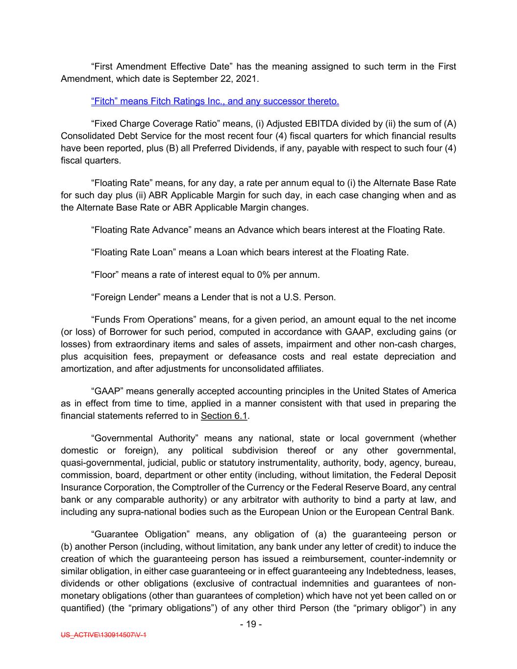 - 19 - US_ACTIVE\130914507\V-1 “First Amendment Effective Date” has the meaning assigned to such term in the First Amendment, which date is September 22, 2021. “Fitch” means Fitch Ratings Inc., and any successor thereto. “Fixed Charge Coverage Ratio” means, (i) Adjusted EBITDA divided by (ii) the sum of (A) Consolidated Debt Service for the most recent four (4) fiscal quarters for which financial results have been reported, plus (B) all Preferred Dividends, if any, payable with respect to such four (4) fiscal quarters. “Floating Rate” means, for any day, a rate per annum equal to (i) the Alternate Base Rate for such day plus (ii) ABR Applicable Margin for such day, in each case changing when and as the Alternate Base Rate or ABR Applicable Margin changes. “Floating Rate Advance” means an Advance which bears interest at the Floating Rate. “Floating Rate Loan” means a Loan which bears interest at the Floating Rate. “Floor” means a rate of interest equal to 0% per annum. “Foreign Lender” means a Lender that is not a U.S. Person. “Funds From Operations” means, for a given period, an amount equal to the net income (or loss) of Borrower for such period, computed in accordance with GAAP, excluding gains (or losses) from extraordinary items and sales of assets, impairment and other non-cash charges, plus acquisition fees, prepayment or defeasance costs and real estate depreciation and amortization, and after adjustments for unconsolidated affiliates. “GAAP” means generally accepted accounting principles in the United States of America as in effect from time to time, applied in a manner consistent with that used in preparing the financial statements referred to in Section 6.1. “Governmental Authority” means any national, state or local government (whether domestic or foreign), any political subdivision thereof or any other governmental, quasi-governmental, judicial, public or statutory instrumentality, authority, body, agency, bureau, commission, board, department or other entity (including, without limitation, the Federal Deposit Insurance Corporation, the Comptroller of the Currency or the Federal Reserve Board, any central bank or any comparable authority) or any arbitrator with authority to bind a party at law, and including any supra-national bodies such as the European Union or the European Central Bank. “Guarantee Obligation” means, any obligation of (a) the guaranteeing person or (b) another Person (including, without limitation, any bank under any letter of credit) to induce the creation of which the guaranteeing person has issued a reimbursement, counter-indemnity or similar obligation, in either case guaranteeing or in effect guaranteeing any Indebtedness, leases, dividends or other obligations (exclusive of contractual indemnities and guarantees of non- monetary obligations (other than guarantees of completion) which have not yet been called on or quantified) (the “primary obligations”) of any other third Person (the “primary obligor”) in any