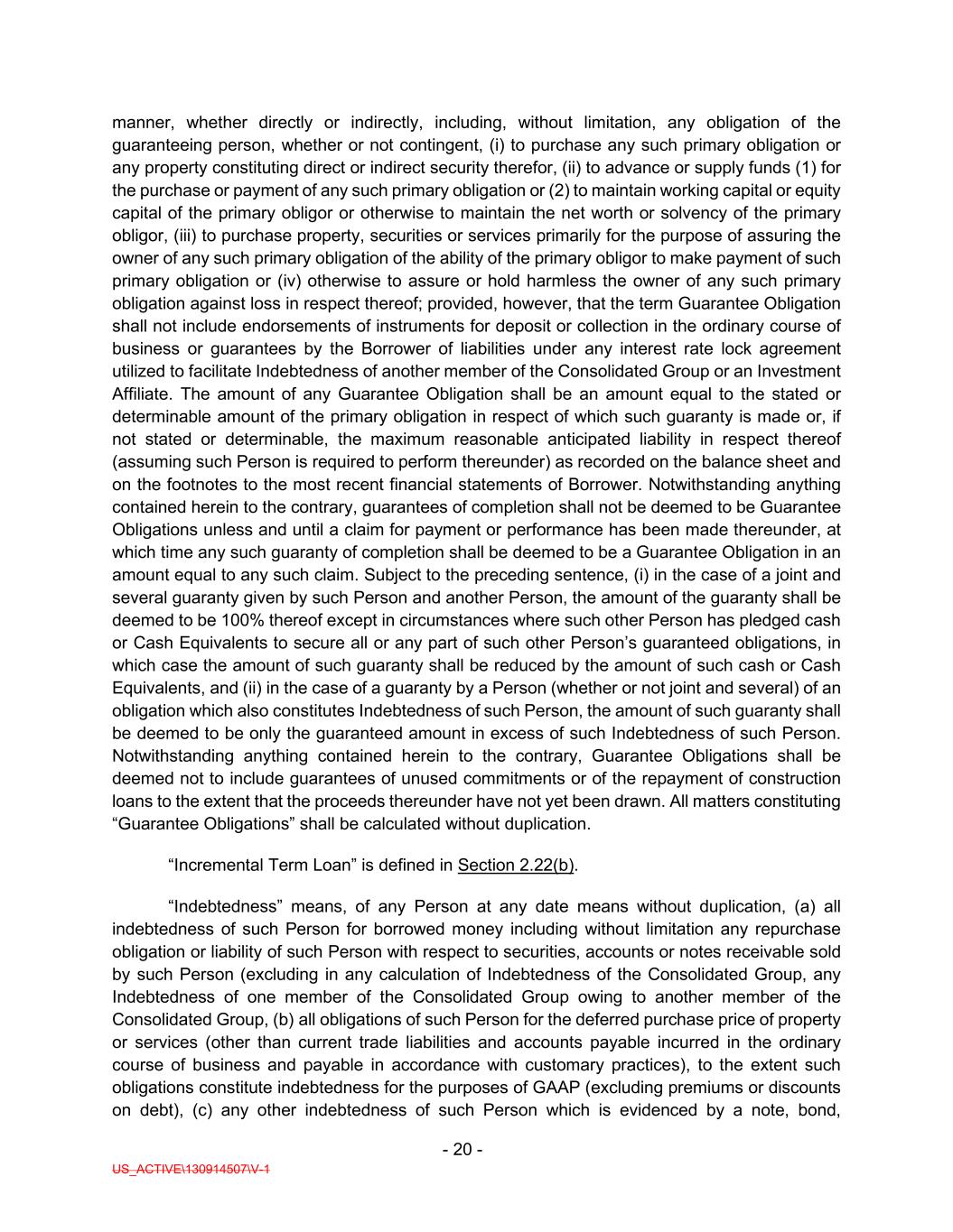 - 20 - US_ACTIVE\130914507\V-1 manner, whether directly or indirectly, including, without limitation, any obligation of the guaranteeing person, whether or not contingent, (i) to purchase any such primary obligation or any property constituting direct or indirect security therefor, (ii) to advance or supply funds (1) for the purchase or payment of any such primary obligation or (2) to maintain working capital or equity capital of the primary obligor or otherwise to maintain the net worth or solvency of the primary obligor, (iii) to purchase property, securities or services primarily for the purpose of assuring the owner of any such primary obligation of the ability of the primary obligor to make payment of such primary obligation or (iv) otherwise to assure or hold harmless the owner of any such primary obligation against loss in respect thereof; provided, however, that the term Guarantee Obligation shall not include endorsements of instruments for deposit or collection in the ordinary course of business or guarantees by the Borrower of liabilities under any interest rate lock agreement utilized to facilitate Indebtedness of another member of the Consolidated Group or an Investment Affiliate. The amount of any Guarantee Obligation shall be an amount equal to the stated or determinable amount of the primary obligation in respect of which such guaranty is made or, if not stated or determinable, the maximum reasonable anticipated liability in respect thereof (assuming such Person is required to perform thereunder) as recorded on the balance sheet and on the footnotes to the most recent financial statements of Borrower. Notwithstanding anything contained herein to the contrary, guarantees of completion shall not be deemed to be Guarantee Obligations unless and until a claim for payment or performance has been made thereunder, at which time any such guaranty of completion shall be deemed to be a Guarantee Obligation in an amount equal to any such claim. Subject to the preceding sentence, (i) in the case of a joint and several guaranty given by such Person and another Person, the amount of the guaranty shall be deemed to be 100% thereof except in circumstances where such other Person has pledged cash or Cash Equivalents to secure all or any part of such other Person’s guaranteed obligations, in which case the amount of such guaranty shall be reduced by the amount of such cash or Cash Equivalents, and (ii) in the case of a guaranty by a Person (whether or not joint and several) of an obligation which also constitutes Indebtedness of such Person, the amount of such guaranty shall be deemed to be only the guaranteed amount in excess of such Indebtedness of such Person. Notwithstanding anything contained herein to the contrary, Guarantee Obligations shall be deemed not to include guarantees of unused commitments or of the repayment of construction loans to the extent that the proceeds thereunder have not yet been drawn. All matters constituting “Guarantee Obligations” shall be calculated without duplication. “Incremental Term Loan” is defined in Section 2.22(b). “Indebtedness” means, of any Person at any date means without duplication, (a) all indebtedness of such Person for borrowed money including without limitation any repurchase obligation or liability of such Person with respect to securities, accounts or notes receivable sold by such Person (excluding in any calculation of Indebtedness of the Consolidated Group, any Indebtedness of one member of the Consolidated Group owing to another member of the Consolidated Group, (b) all obligations of such Person for the deferred purchase price of property or services (other than current trade liabilities and accounts payable incurred in the ordinary course of business and payable in accordance with customary practices), to the extent such obligations constitute indebtedness for the purposes of GAAP (excluding premiums or discounts on debt), (c) any other indebtedness of such Person which is evidenced by a note, bond,