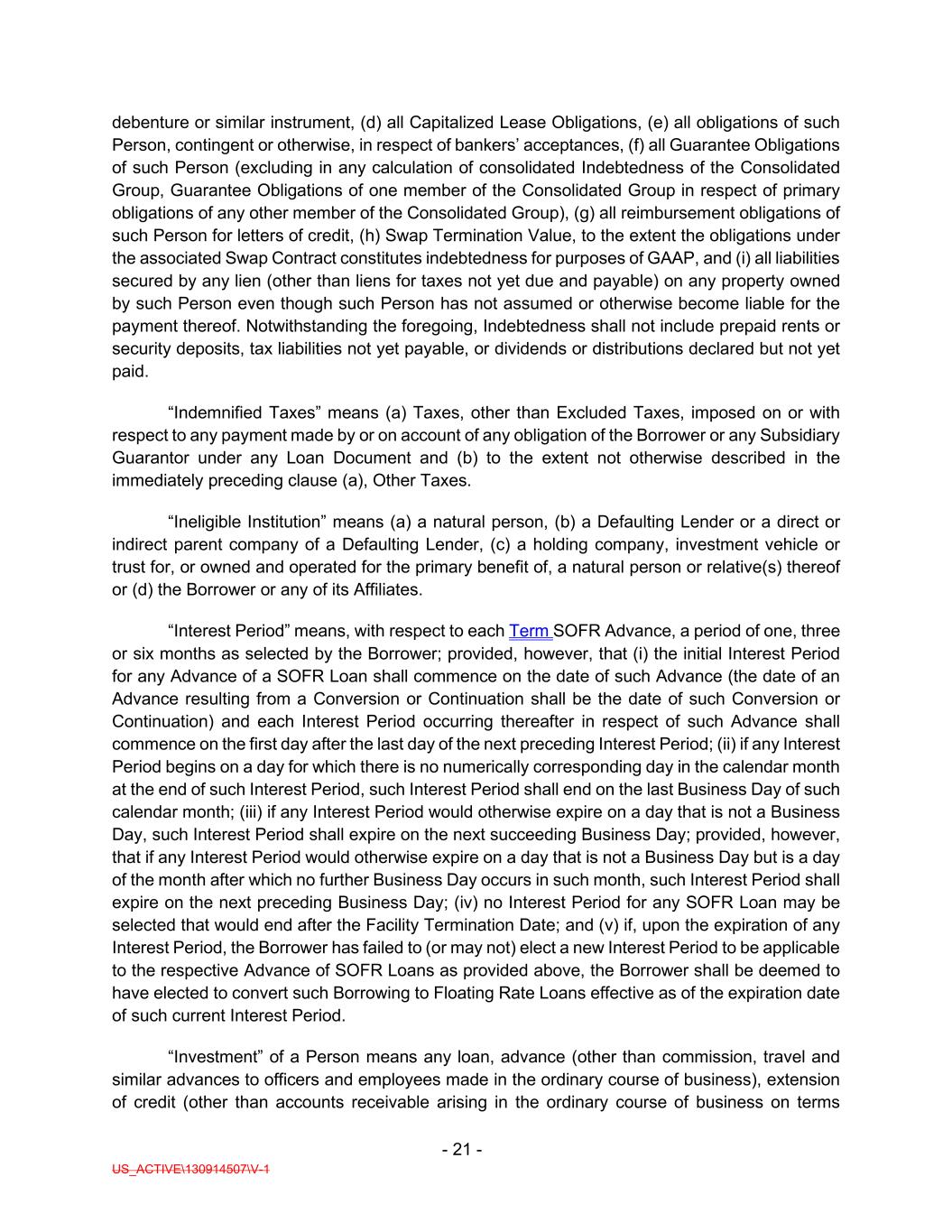 - 21 - US_ACTIVE\130914507\V-1 debenture or similar instrument, (d) all Capitalized Lease Obligations, (e) all obligations of such Person, contingent or otherwise, in respect of bankers’ acceptances, (f) all Guarantee Obligations of such Person (excluding in any calculation of consolidated Indebtedness of the Consolidated Group, Guarantee Obligations of one member of the Consolidated Group in respect of primary obligations of any other member of the Consolidated Group), (g) all reimbursement obligations of such Person for letters of credit, (h) Swap Termination Value, to the extent the obligations under the associated Swap Contract constitutes indebtedness for purposes of GAAP, and (i) all liabilities secured by any lien (other than liens for taxes not yet due and payable) on any property owned by such Person even though such Person has not assumed or otherwise become liable for the payment thereof. Notwithstanding the foregoing, Indebtedness shall not include prepaid rents or security deposits, tax liabilities not yet payable, or dividends or distributions declared but not yet paid. “Indemnified Taxes” means (a) Taxes, other than Excluded Taxes, imposed on or with respect to any payment made by or on account of any obligation of the Borrower or any Subsidiary Guarantor under any Loan Document and (b) to the extent not otherwise described in the immediately preceding clause (a), Other Taxes. “Ineligible Institution” means (a) a natural person, (b) a Defaulting Lender or a direct or indirect parent company of a Defaulting Lender, (c) a holding company, investment vehicle or trust for, or owned and operated for the primary benefit of, a natural person or relative(s) thereof or (d) the Borrower or any of its Affiliates. “Interest Period” means, with respect to each Term SOFR Advance, a period of one, three or six months as selected by the Borrower; provided, however, that (i) the initial Interest Period for any Advance of a SOFR Loan shall commence on the date of such Advance (the date of an Advance resulting from a Conversion or Continuation shall be the date of such Conversion or Continuation) and each Interest Period occurring thereafter in respect of such Advance shall commence on the first day after the last day of the next preceding Interest Period; (ii) if any Interest Period begins on a day for which there is no numerically corresponding day in the calendar month at the end of such Interest Period, such Interest Period shall end on the last Business Day of such calendar month; (iii) if any Interest Period would otherwise expire on a day that is not a Business Day, such Interest Period shall expire on the next succeeding Business Day; provided, however, that if any Interest Period would otherwise expire on a day that is not a Business Day but is a day of the month after which no further Business Day occurs in such month, such Interest Period shall expire on the next preceding Business Day; (iv) no Interest Period for any SOFR Loan may be selected that would end after the Facility Termination Date; and (v) if, upon the expiration of any Interest Period, the Borrower has failed to (or may not) elect a new Interest Period to be applicable to the respective Advance of SOFR Loans as provided above, the Borrower shall be deemed to have elected to convert such Borrowing to Floating Rate Loans effective as of the expiration date of such current Interest Period. “Investment” of a Person means any loan, advance (other than commission, travel and similar advances to officers and employees made in the ordinary course of business), extension of credit (other than accounts receivable arising in the ordinary course of business on terms