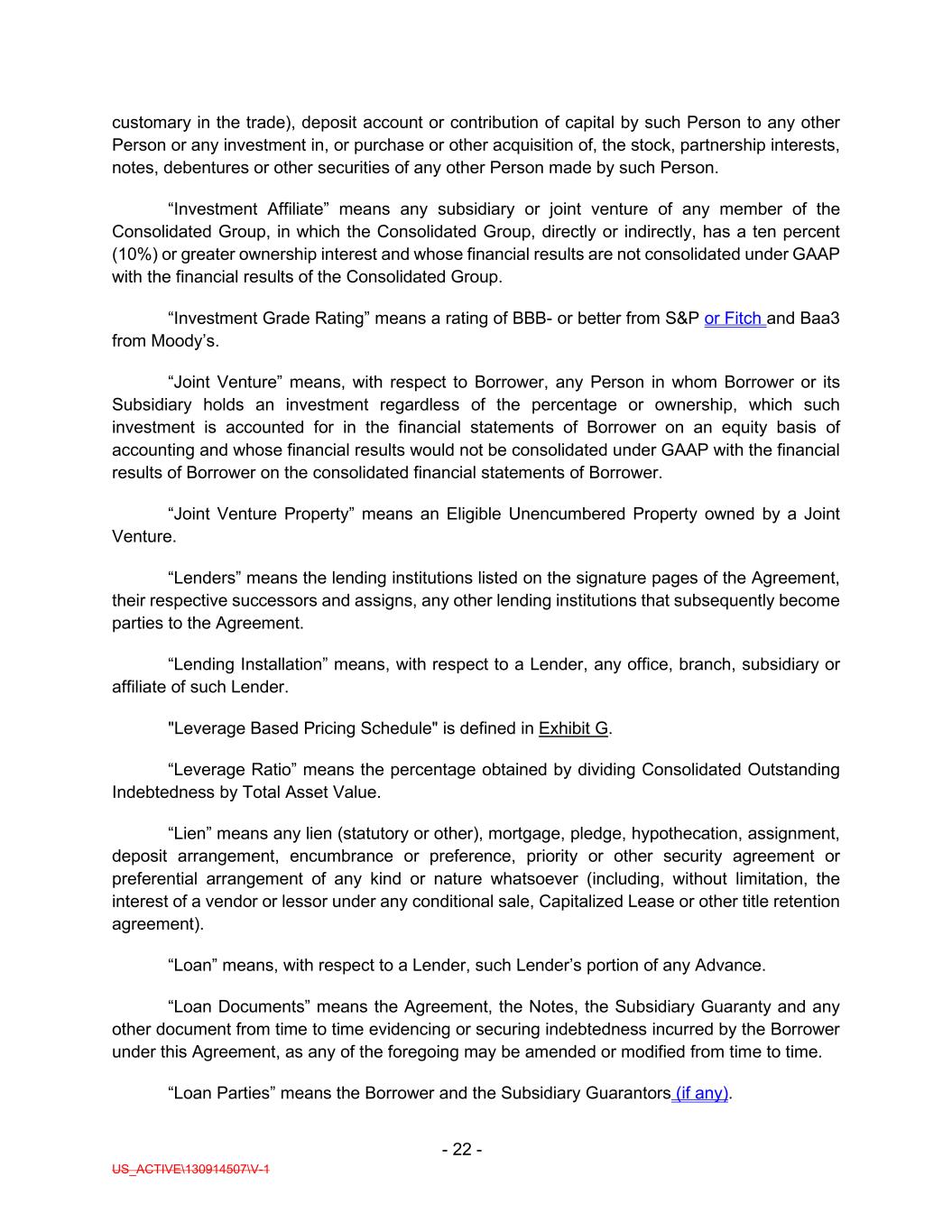 - 22 - US_ACTIVE\130914507\V-1 customary in the trade), deposit account or contribution of capital by such Person to any other Person or any investment in, or purchase or other acquisition of, the stock, partnership interests, notes, debentures or other securities of any other Person made by such Person. “Investment Affiliate” means any subsidiary or joint venture of any member of the Consolidated Group, in which the Consolidated Group, directly or indirectly, has a ten percent (10%) or greater ownership interest and whose financial results are not consolidated under GAAP with the financial results of the Consolidated Group. “Investment Grade Rating” means a rating of BBB- or better from S&P or Fitch and Baa3 from Moody’s. “Joint Venture” means, with respect to Borrower, any Person in whom Borrower or its Subsidiary holds an investment regardless of the percentage or ownership, which such investment is accounted for in the financial statements of Borrower on an equity basis of accounting and whose financial results would not be consolidated under GAAP with the financial results of Borrower on the consolidated financial statements of Borrower. “Joint Venture Property” means an Eligible Unencumbered Property owned by a Joint Venture. “Lenders” means the lending institutions listed on the signature pages of the Agreement, their respective successors and assigns, any other lending institutions that subsequently become parties to the Agreement. “Lending Installation” means, with respect to a Lender, any office, branch, subsidiary or affiliate of such Lender. "Leverage Based Pricing Schedule" is defined in Exhibit G. “Leverage Ratio” means the percentage obtained by dividing Consolidated Outstanding Indebtedness by Total Asset Value. “Lien” means any lien (statutory or other), mortgage, pledge, hypothecation, assignment, deposit arrangement, encumbrance or preference, priority or other security agreement or preferential arrangement of any kind or nature whatsoever (including, without limitation, the interest of a vendor or lessor under any conditional sale, Capitalized Lease or other title retention agreement). “Loan” means, with respect to a Lender, such Lender’s portion of any Advance. “Loan Documents” means the Agreement, the Notes, the Subsidiary Guaranty and any other document from time to time evidencing or securing indebtedness incurred by the Borrower under this Agreement, as any of the foregoing may be amended or modified from time to time. “Loan Parties” means the Borrower and the Subsidiary Guarantors (if any).