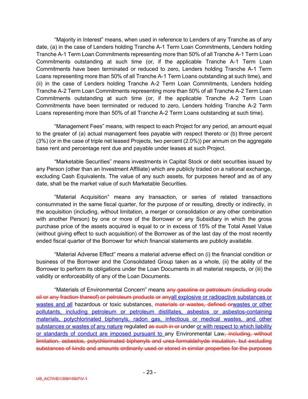 - 23 - US_ACTIVE\130914507\V-1 “Majority in Interest” means, when used in reference to Lenders of any Tranche as of any date, (a) in the case of Lenders holding Tranche A-1 Term Loan Commitments, Lenders holding Tranche A-1 Term Loan Commitments representing more than 50% of all Tranche A-1 Term Loan Commitments outstanding at such time (or, if the applicable Tranche A-1 Term Loan Commitments have been terminated or reduced to zero, Lenders holding Tranche A-1 Term Loans representing more than 50% of all Tranche A-1 Term Loans outstanding at such time), and (ii) in the case of Lenders holding Tranche A-2 Term Loan Commitments, Lenders holding Tranche A-2 Term Loan Commitments representing more than 50% of all Tranche A-2 Term Loan Commitments outstanding at such time (or, if the applicable Tranche A-2 Term Loan Commitments have been terminated or reduced to zero, Lenders holding Tranche A-2 Term Loans representing more than 50% of all Tranche A-2 Term Loans outstanding at such time). “Management Fees” means, with respect to each Project for any period, an amount equal to the greater of (a) actual management fees payable with respect thereto or (b) three percent (3%) (or in the case of triple net leased Projects, two percent (2.0%)) per annum on the aggregate base rent and percentage rent due and payable under leases at such Project. “Marketable Securities” means investments in Capital Stock or debt securities issued by any Person (other than an Investment Affiliate) which are publicly traded on a national exchange, excluding Cash Equivalents. The value of any such assets, for purposes hereof and as of any date, shall be the market value of such Marketable Securities. “Material Acquisition” means any transaction, or series of related transactions consummated in the same fiscal quarter, for the purpose of or resulting, directly or indirectly, in the acquisition (including, without limitation, a merger or consolidation or any other combination with another Person) by one or more of the Borrower or any Subsidiary in which the gross purchase price of the assets acquired is equal to or in excess of 15% of the Total Asset Value (without giving effect to such acquisition) of the Borrower as of the last day of the most recently ended fiscal quarter of the Borrower for which financial statements are publicly available. “Material Adverse Effect” means a material adverse effect on (i) the financial condition or business of the Borrower and the Consolidated Group taken as a whole, (ii) the ability of the Borrower to perform its obligations under the Loan Documents in all material respects, or (iii) the validity or enforceability of any of the Loan Documents. “Materials of Environmental Concern” means any gasoline or petroleum (including crude oil or any fraction thereof) or petroleum products or anyall explosive or radioactive substances or wastes and all hazardous or toxic substances, materials or wastes, defined orwastes or other pollutants, including petroleum or petroleum distillates, asbestos or asbestos-containing materials, polychlorinated biphenyls, radon gas, infectious or medical wastes, and other substances or wastes of any nature regulated as such in or under or with respect to which liability or standards of conduct are imposed pursuant to any Environmental Law, including, without limitation, asbestos, polychlorinated biphenyls and urea-formaldehyde insulation, but excluding substances of kinds and amounts ordinarily used or stored in similar properties for the purposes