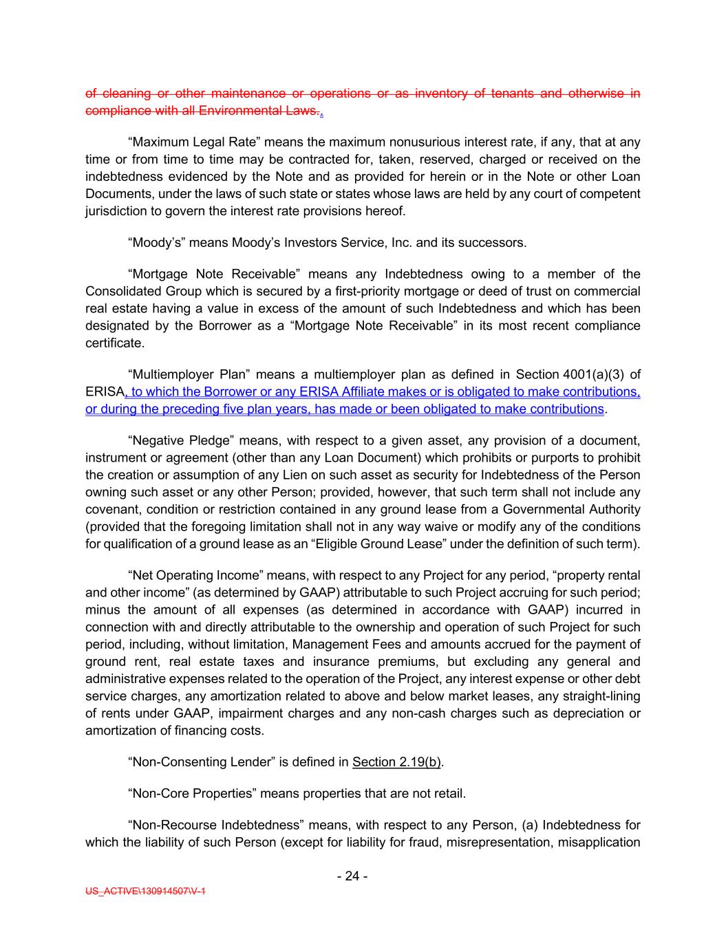 - 24 - US_ACTIVE\130914507\V-1 of cleaning or other maintenance or operations or as inventory of tenants and otherwise in compliance with all Environmental Laws.. “Maximum Legal Rate” means the maximum nonusurious interest rate, if any, that at any time or from time to time may be contracted for, taken, reserved, charged or received on the indebtedness evidenced by the Note and as provided for herein or in the Note or other Loan Documents, under the laws of such state or states whose laws are held by any court of competent jurisdiction to govern the interest rate provisions hereof. “Moody’s” means Moody’s Investors Service, Inc. and its successors. “Mortgage Note Receivable” means any Indebtedness owing to a member of the Consolidated Group which is secured by a first-priority mortgage or deed of trust on commercial real estate having a value in excess of the amount of such Indebtedness and which has been designated by the Borrower as a “Mortgage Note Receivable” in its most recent compliance certificate. “Multiemployer Plan” means a multiemployer plan as defined in Section 4001(a)(3) of ERISA, to which the Borrower or any ERISA Affiliate makes or is obligated to make contributions, or during the preceding five plan years, has made or been obligated to make contributions. “Negative Pledge” means, with respect to a given asset, any provision of a document, instrument or agreement (other than any Loan Document) which prohibits or purports to prohibit the creation or assumption of any Lien on such asset as security for Indebtedness of the Person owning such asset or any other Person; provided, however, that such term shall not include any covenant, condition or restriction contained in any ground lease from a Governmental Authority (provided that the foregoing limitation shall not in any way waive or modify any of the conditions for qualification of a ground lease as an “Eligible Ground Lease” under the definition of such term). “Net Operating Income” means, with respect to any Project for any period, “property rental and other income” (as determined by GAAP) attributable to such Project accruing for such period; minus the amount of all expenses (as determined in accordance with GAAP) incurred in connection with and directly attributable to the ownership and operation of such Project for such period, including, without limitation, Management Fees and amounts accrued for the payment of ground rent, real estate taxes and insurance premiums, but excluding any general and administrative expenses related to the operation of the Project, any interest expense or other debt service charges, any amortization related to above and below market leases, any straight-lining of rents under GAAP, impairment charges and any non-cash charges such as depreciation or amortization of financing costs. “Non-Consenting Lender” is defined in Section 2.19(b). “Non-Core Properties” means properties that are not retail. “Non-Recourse Indebtedness” means, with respect to any Person, (a) Indebtedness for which the liability of such Person (except for liability for fraud, misrepresentation, misapplication
