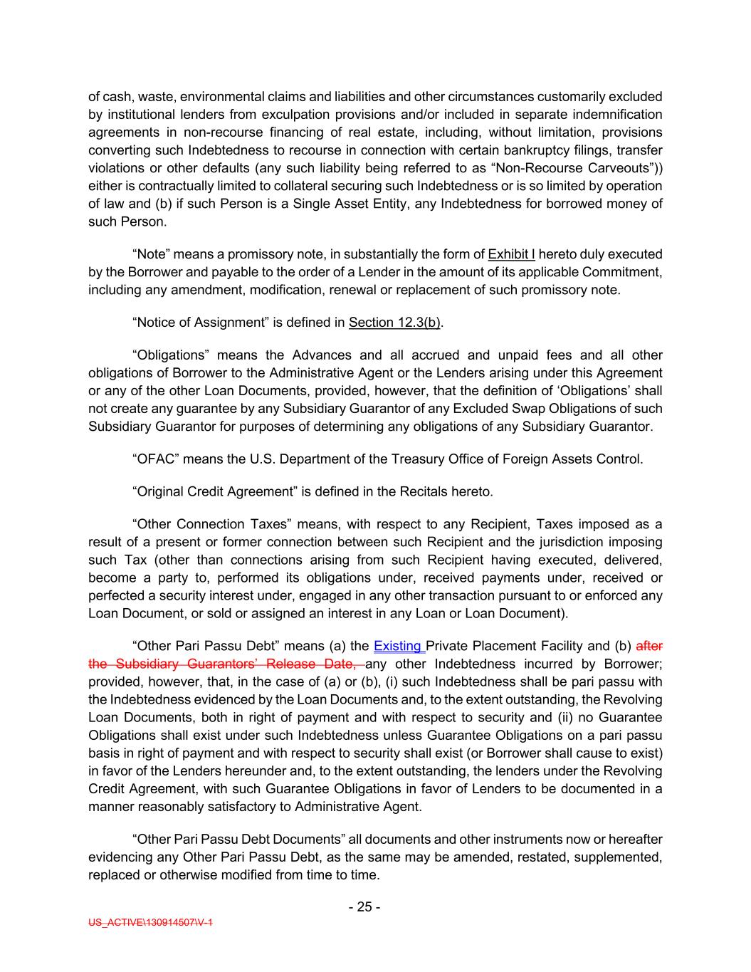 - 25 - US_ACTIVE\130914507\V-1 of cash, waste, environmental claims and liabilities and other circumstances customarily excluded by institutional lenders from exculpation provisions and/or included in separate indemnification agreements in non-recourse financing of real estate, including, without limitation, provisions converting such Indebtedness to recourse in connection with certain bankruptcy filings, transfer violations or other defaults (any such liability being referred to as “Non-Recourse Carveouts”)) either is contractually limited to collateral securing such Indebtedness or is so limited by operation of law and (b) if such Person is a Single Asset Entity, any Indebtedness for borrowed money of such Person. “Note” means a promissory note, in substantially the form of Exhibit I hereto duly executed by the Borrower and payable to the order of a Lender in the amount of its applicable Commitment, including any amendment, modification, renewal or replacement of such promissory note. “Notice of Assignment” is defined in Section 12.3(b). “Obligations” means the Advances and all accrued and unpaid fees and all other obligations of Borrower to the Administrative Agent or the Lenders arising under this Agreement or any of the other Loan Documents, provided, however, that the definition of ‘Obligations’ shall not create any guarantee by any Subsidiary Guarantor of any Excluded Swap Obligations of such Subsidiary Guarantor for purposes of determining any obligations of any Subsidiary Guarantor. “OFAC” means the U.S. Department of the Treasury Office of Foreign Assets Control. “Original Credit Agreement” is defined in the Recitals hereto. “Other Connection Taxes” means, with respect to any Recipient, Taxes imposed as a result of a present or former connection between such Recipient and the jurisdiction imposing such Tax (other than connections arising from such Recipient having executed, delivered, become a party to, performed its obligations under, received payments under, received or perfected a security interest under, engaged in any other transaction pursuant to or enforced any Loan Document, or sold or assigned an interest in any Loan or Loan Document). “Other Pari Passu Debt” means (a) the Existing Private Placement Facility and (b) after the Subsidiary Guarantors’ Release Date, any other Indebtedness incurred by Borrower; provided, however, that, in the case of (a) or (b), (i) such Indebtedness shall be pari passu with the Indebtedness evidenced by the Loan Documents and, to the extent outstanding, the Revolving Loan Documents, both in right of payment and with respect to security and (ii) no Guarantee Obligations shall exist under such Indebtedness unless Guarantee Obligations on a pari passu basis in right of payment and with respect to security shall exist (or Borrower shall cause to exist) in favor of the Lenders hereunder and, to the extent outstanding, the lenders under the Revolving Credit Agreement, with such Guarantee Obligations in favor of Lenders to be documented in a manner reasonably satisfactory to Administrative Agent. “Other Pari Passu Debt Documents” all documents and other instruments now or hereafter evidencing any Other Pari Passu Debt, as the same may be amended, restated, supplemented, replaced or otherwise modified from time to time.