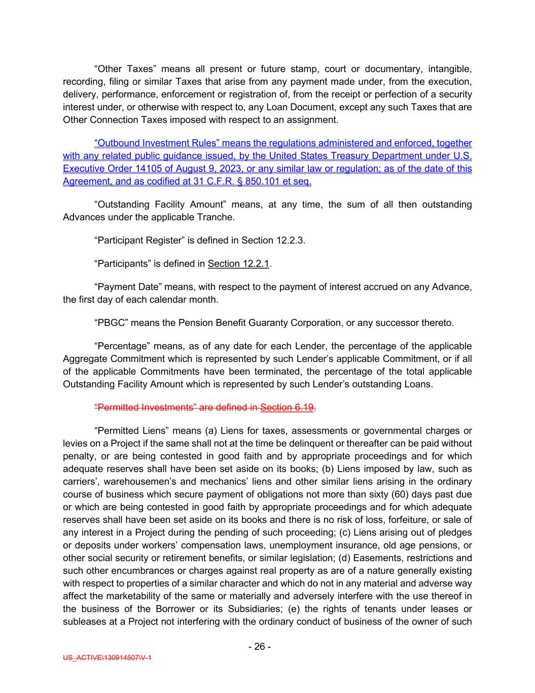 - 26 - US_ACTIVE\130914507\V-1 “Other Taxes” means all present or future stamp, court or documentary, intangible, recording, filing or similar Taxes that arise from any payment made under, from the execution, delivery, performance, enforcement or registration of, from the receipt or perfection of a security interest under, or otherwise with respect to, any Loan Document, except any such Taxes that are Other Connection Taxes imposed with respect to an assignment. “Outbound Investment Rules” means the regulations administered and enforced, together with any related public guidance issued, by the United States Treasury Department under U.S. Executive Order 14105 of August 9, 2023, or any similar law or regulation; as of the date of this Agreement, and as codified at 31 C.F.R. § 850.101 et seq. “Outstanding Facility Amount” means, at any time, the sum of all then outstanding Advances under the applicable Tranche. “Participant Register” is defined in Section 12.2.3. “Participants” is defined in Section 12.2.1. “Payment Date” means, with respect to the payment of interest accrued on any Advance, the first day of each calendar month. “PBGC” means the Pension Benefit Guaranty Corporation, or any successor thereto. “Percentage” means, as of any date for each Lender, the percentage of the applicable Aggregate Commitment which is represented by such Lender’s applicable Commitment, or if all of the applicable Commitments have been terminated, the percentage of the total applicable Outstanding Facility Amount which is represented by such Lender’s outstanding Loans. “Permitted Investments” are defined in Section 6.19. “Permitted Liens” means (a) Liens for taxes, assessments or governmental charges or levies on a Project if the same shall not at the time be delinquent or thereafter can be paid without penalty, or are being contested in good faith and by appropriate proceedings and for which adequate reserves shall have been set aside on its books; (b) Liens imposed by law, such as carriers’, warehousemen’s and mechanics’ liens and other similar liens arising in the ordinary course of business which secure payment of obligations not more than sixty (60) days past due or which are being contested in good faith by appropriate proceedings and for which adequate reserves shall have been set aside on its books and there is no risk of loss, forfeiture, or sale of any interest in a Project during the pending of such proceeding; (c) Liens arising out of pledges or deposits under workers’ compensation laws, unemployment insurance, old age pensions, or other social security or retirement benefits, or similar legislation; (d) Easements, restrictions and such other encumbrances or charges against real property as are of a nature generally existing with respect to properties of a similar character and which do not in any material and adverse way affect the marketability of the same or materially and adversely interfere with the use thereof in the business of the Borrower or its Subsidiaries; (e) the rights of tenants under leases or subleases at a Project not interfering with the ordinary conduct of business of the owner of such