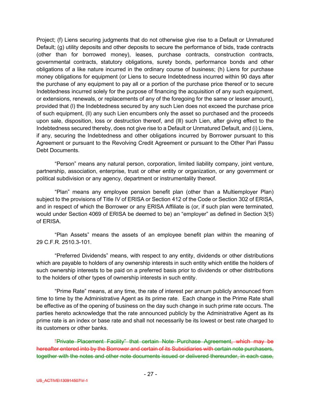 - 27 - US_ACTIVE\130914507\V-1 Project; (f) Liens securing judgments that do not otherwise give rise to a Default or Unmatured Default; (g) utility deposits and other deposits to secure the performance of bids, trade contracts (other than for borrowed money), leases, purchase contracts, construction contracts, governmental contracts, statutory obligations, surety bonds, performance bonds and other obligations of a like nature incurred in the ordinary course of business; (h) Liens for purchase money obligations for equipment (or Liens to secure Indebtedness incurred within 90 days after the purchase of any equipment to pay all or a portion of the purchase price thereof or to secure Indebtedness incurred solely for the purpose of financing the acquisition of any such equipment, or extensions, renewals, or replacements of any of the foregoing for the same or lesser amount), provided that (l) the Indebtedness secured by any such Lien does not exceed the purchase price of such equipment, (ll) any such Lien encumbers only the asset so purchased and the proceeds upon sale, disposition, loss or destruction thereof, and (lll) such Lien, after giving effect to the Indebtedness secured thereby, does not give rise to a Default or Unmatured Default, and (i) Liens, if any, securing the Indebtedness and other obligations incurred by Borrower pursuant to this Agreement or pursuant to the Revolving Credit Agreement or pursuant to the Other Pari Passu Debt Documents. “Person” means any natural person, corporation, limited liability company, joint venture, partnership, association, enterprise, trust or other entity or organization, or any government or political subdivision or any agency, department or instrumentality thereof. “Plan” means any employee pension benefit plan (other than a Multiemployer Plan) subject to the provisions of Title IV of ERISA or Section 412 of the Code or Section 302 of ERISA, and in respect of which the Borrower or any ERISA Affiliate is (or, if such plan were terminated, would under Section 4069 of ERISA be deemed to be) an “employer” as defined in Section 3(5) of ERISA. “Plan Assets” means the assets of an employee benefit plan within the meaning of 29 C.F.R. 2510.3-101. “Preferred Dividends” means, with respect to any entity, dividends or other distributions which are payable to holders of any ownership interests in such entity which entitle the holders of such ownership interests to be paid on a preferred basis prior to dividends or other distributions to the holders of other types of ownership interests in such entity. “Prime Rate” means, at any time, the rate of interest per annum publicly announced from time to time by the Administrative Agent as its prime rate. Each change in the Prime Rate shall be effective as of the opening of business on the day such change in such prime rate occurs. The parties hereto acknowledge that the rate announced publicly by the Administrative Agent as its prime rate is an index or base rate and shall not necessarily be its lowest or best rate charged to its customers or other banks. “Private Placement Facility” that certain Note Purchase Agreement, which may be hereafter entered into by the Borrower and certain of its Subsidiaries with certain note purchasers, together with the notes and other note documents issued or delivered thereunder, in each case,