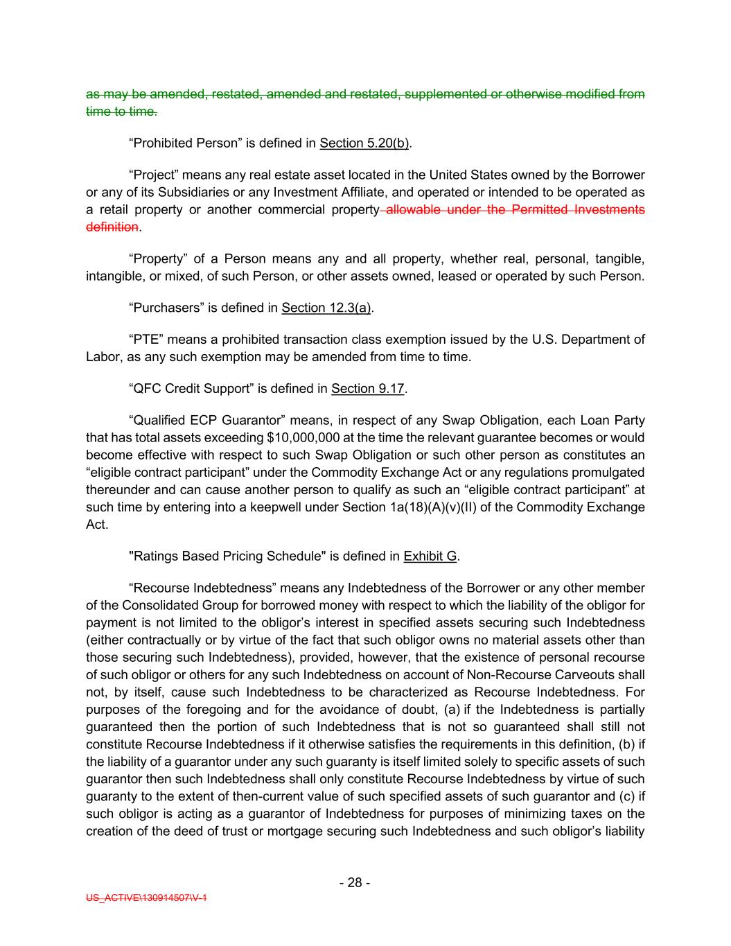 - 28 - US_ACTIVE\130914507\V-1 as may be amended, restated, amended and restated, supplemented or otherwise modified from time to time. “Prohibited Person” is defined in Section 5.20(b). “Project” means any real estate asset located in the United States owned by the Borrower or any of its Subsidiaries or any Investment Affiliate, and operated or intended to be operated as a retail property or another commercial property allowable under the Permitted Investments definition. “Property” of a Person means any and all property, whether real, personal, tangible, intangible, or mixed, of such Person, or other assets owned, leased or operated by such Person. “Purchasers” is defined in Section 12.3(a). “PTE” means a prohibited transaction class exemption issued by the U.S. Department of Labor, as any such exemption may be amended from time to time. “QFC Credit Support” is defined in Section 9.17. “Qualified ECP Guarantor” means, in respect of any Swap Obligation, each Loan Party that has total assets exceeding $10,000,000 at the time the relevant guarantee becomes or would become effective with respect to such Swap Obligation or such other person as constitutes an “eligible contract participant” under the Commodity Exchange Act or any regulations promulgated thereunder and can cause another person to qualify as such an “eligible contract participant” at such time by entering into a keepwell under Section 1a(18)(A)(v)(II) of the Commodity Exchange Act. "Ratings Based Pricing Schedule" is defined in Exhibit G. “Recourse Indebtedness” means any Indebtedness of the Borrower or any other member of the Consolidated Group for borrowed money with respect to which the liability of the obligor for payment is not limited to the obligor’s interest in specified assets securing such Indebtedness (either contractually or by virtue of the fact that such obligor owns no material assets other than those securing such Indebtedness), provided, however, that the existence of personal recourse of such obligor or others for any such Indebtedness on account of Non-Recourse Carveouts shall not, by itself, cause such Indebtedness to be characterized as Recourse Indebtedness. For purposes of the foregoing and for the avoidance of doubt, (a) if the Indebtedness is partially guaranteed then the portion of such Indebtedness that is not so guaranteed shall still not constitute Recourse Indebtedness if it otherwise satisfies the requirements in this definition, (b) if the liability of a guarantor under any such guaranty is itself limited solely to specific assets of such guarantor then such Indebtedness shall only constitute Recourse Indebtedness by virtue of such guaranty to the extent of then-current value of such specified assets of such guarantor and (c) if such obligor is acting as a guarantor of Indebtedness for purposes of minimizing taxes on the creation of the deed of trust or mortgage securing such Indebtedness and such obligor’s liability