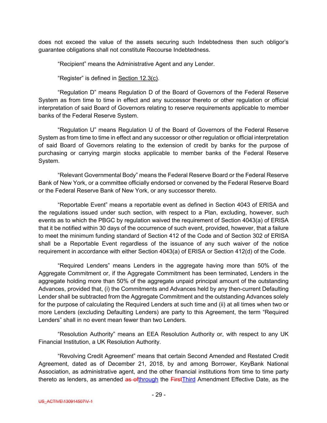 - 29 - US_ACTIVE\130914507\V-1 does not exceed the value of the assets securing such Indebtedness then such obligor’s guarantee obligations shall not constitute Recourse Indebtedness. “Recipient” means the Administrative Agent and any Lender. “Register” is defined in Section 12.3(c). “Regulation D” means Regulation D of the Board of Governors of the Federal Reserve System as from time to time in effect and any successor thereto or other regulation or official interpretation of said Board of Governors relating to reserve requirements applicable to member banks of the Federal Reserve System. “Regulation U” means Regulation U of the Board of Governors of the Federal Reserve System as from time to time in effect and any successor or other regulation or official interpretation of said Board of Governors relating to the extension of credit by banks for the purpose of purchasing or carrying margin stocks applicable to member banks of the Federal Reserve System. “Relevant Governmental Body” means the Federal Reserve Board or the Federal Reserve Bank of New York, or a committee officially endorsed or convened by the Federal Reserve Board or the Federal Reserve Bank of New York, or any successor thereto. “Reportable Event” means a reportable event as defined in Section 4043 of ERISA and the regulations issued under such section, with respect to a Plan, excluding, however, such events as to which the PBGC by regulation waived the requirement of Section 4043(a) of ERISA that it be notified within 30 days of the occurrence of such event, provided, however, that a failure to meet the minimum funding standard of Section 412 of the Code and of Section 302 of ERISA shall be a Reportable Event regardless of the issuance of any such waiver of the notice requirement in accordance with either Section 4043(a) of ERISA or Section 412(d) of the Code. “Required Lenders” means Lenders in the aggregate having more than 50% of the Aggregate Commitment or, if the Aggregate Commitment has been terminated, Lenders in the aggregate holding more than 50% of the aggregate unpaid principal amount of the outstanding Advances, provided that, (i) the Commitments and Advances held by any then-current Defaulting Lender shall be subtracted from the Aggregate Commitment and the outstanding Advances solely for the purpose of calculating the Required Lenders at such time and (ii) at all times when two or more Lenders (excluding Defaulting Lenders) are party to this Agreement, the term “Required Lenders” shall in no event mean fewer than two Lenders. “Resolution Authority” means an EEA Resolution Authority or, with respect to any UK Financial Institution, a UK Resolution Authority. “Revolving Credit Agreement” means that certain Second Amended and Restated Credit Agreement, dated as of December 21, 2018, by and among Borrower, KeyBank National Association, as administrative agent, and the other financial institutions from time to time party thereto as lenders, as amended as ofthrough the FirstThird Amendment Effective Date, as the